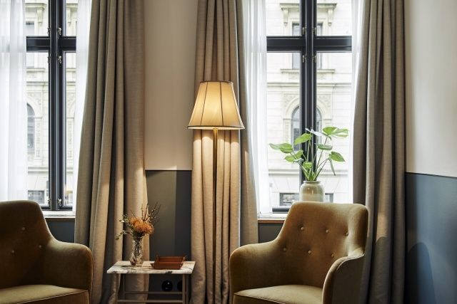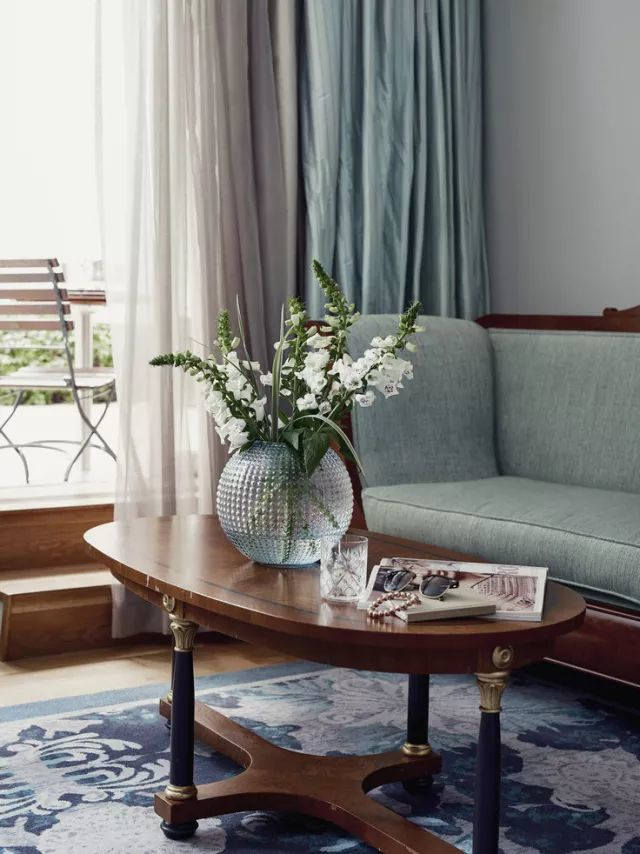 ▲ 這間則讓人第一眼感受到滿滿的典雅和復古氣息,因為使用了顏色沉穩的胡桃木家具,天鵝絨窗簾的復古綠、羊毛地毯的孔雀藍也極具年代感……這些都是顏色和材質在起作用。