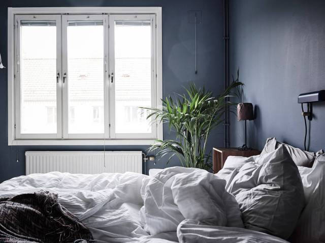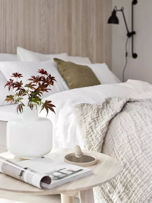 ▲ 這間臥室采用大面積原木做基底,黑色線條勾勒,棉麻材質填充,植物點綴,用色冷靜而克制,大地色系和豐富的天然材質營造出自然樸素的氛圍。