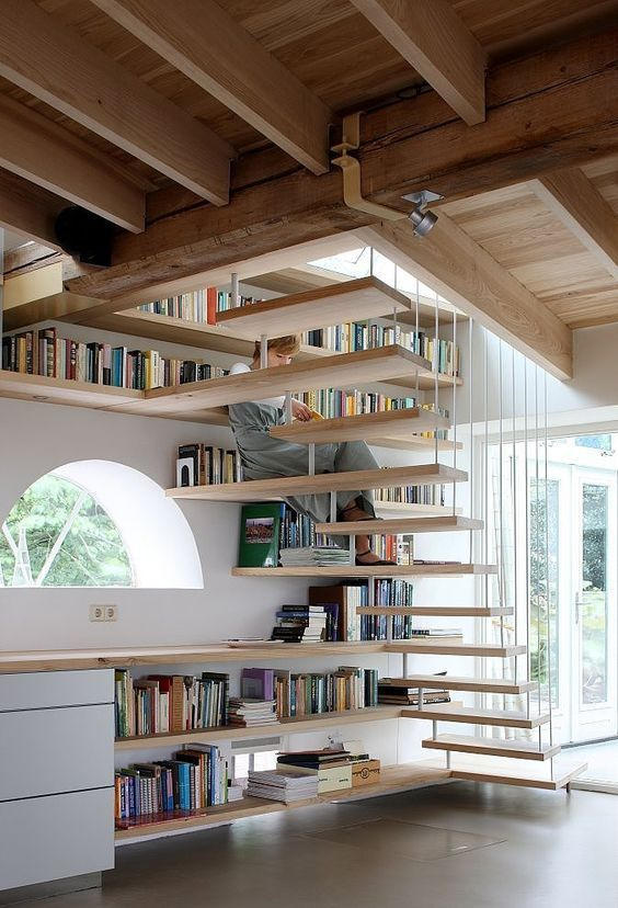 沿著樓梯設(shè)計(jì)書架是很多書店會用到的創(chuàng)意,現(xiàn)在你可以把這個(gè)創(chuàng)意搬到自己家,想看書的時(shí)候隨時(shí)坐下來,是不是超方便~