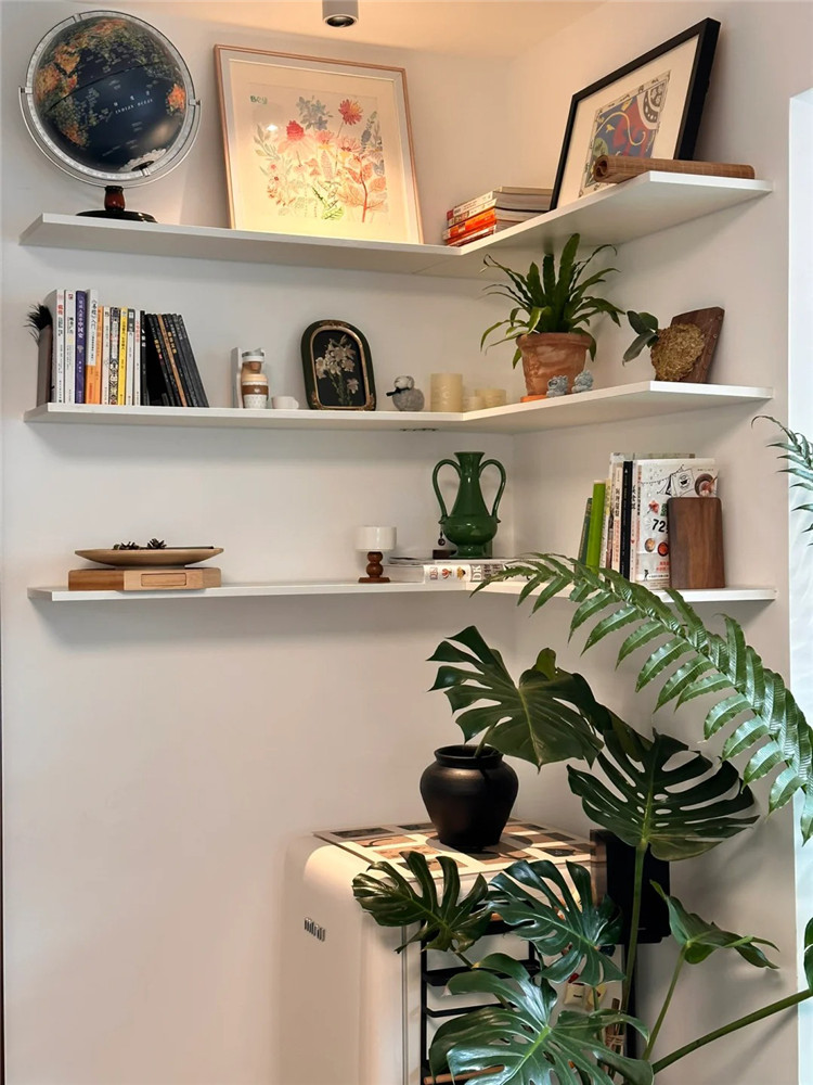 無論是客廳、餐廳、臥室亦或是陽臺,都可以在轉角區域安裝一些隔板,整體錯落有致,別有生趣。