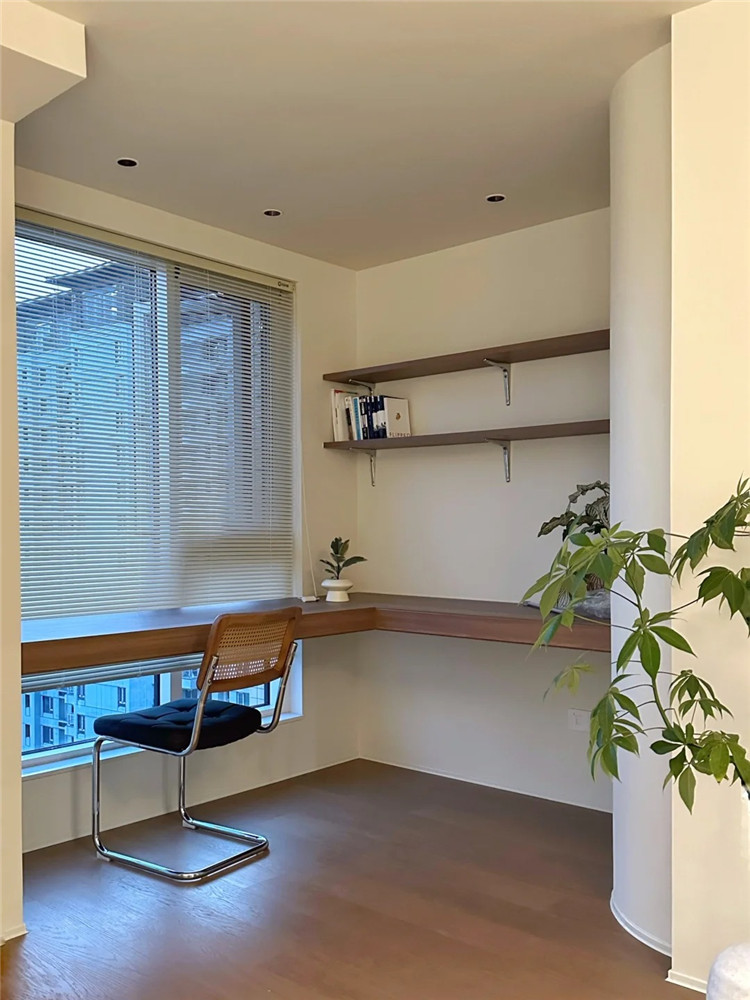 位于飄窗旁的轉角,可定制開放式收納格,增加儲物量的同時,也不壓縮空間,兼顧了顏值與實用性。