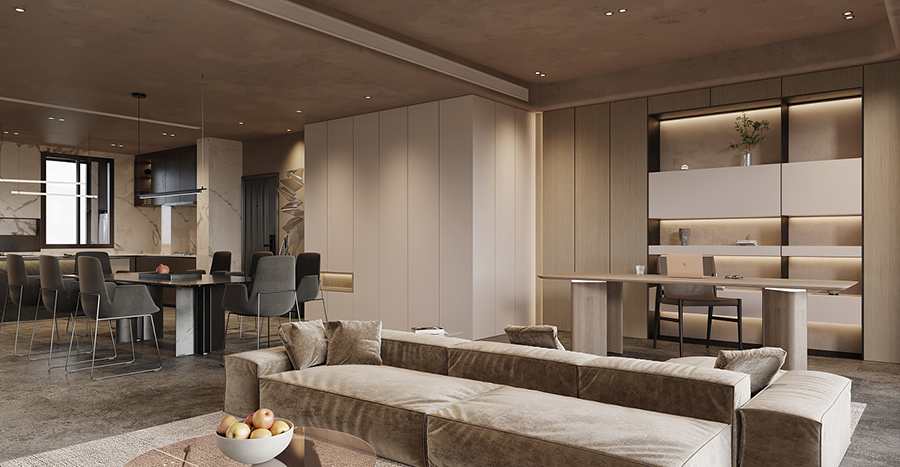 該別墅坐落為一位退休老人所有,坐落于相對比較成熟的商圈地段中。而業主希望設計師能夠將別墅空間進行合理的規劃設計,在滿足自己與家人使用需求的前提下,追求一份靜謐、舒適的自然氣息,以便自己頤養天年。因此設計師在對該空間進行規劃設計的時候,以退休老人及其家人的需求為主設計思路,根據起居需求打造了書房、停車間等區域,以提升生活品質。