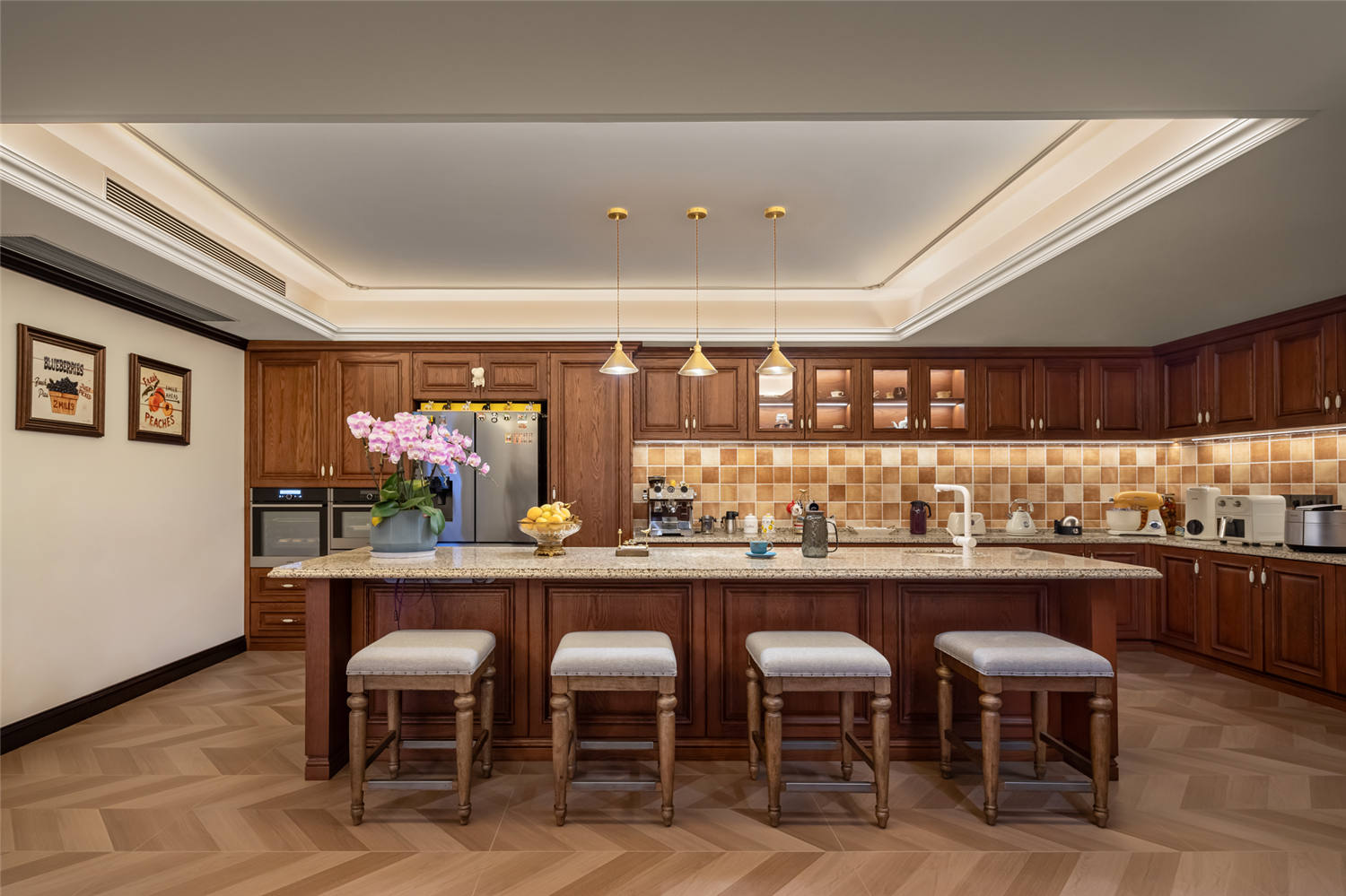 這是一套位于長源假日港灣三層別墅,建筑面積約為290㎡,空間相對比較富足,可供居住者自由分配。戶型上,該別墅空間南北通透,整體結構相對比較方正,沒有較多犄角空間。設計師在對該別墅進行設計時,充分考慮了業主的需求,將一層外部空間直接打通為停車區域,滿足停車需求。同時,將會客區域與休憩區域設置于不同樓層,有效提升了居住私密性。