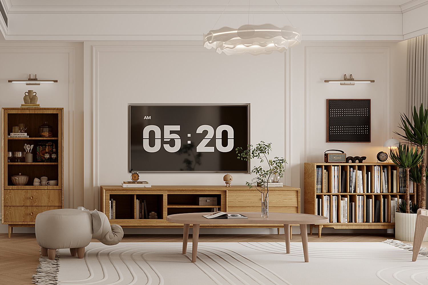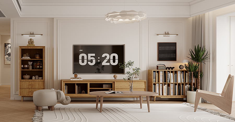客廳借用大面積的書柜作為背景墻裝飾,簡約而又不失使用感,同時還有效提升了空間的文藝氛圍。