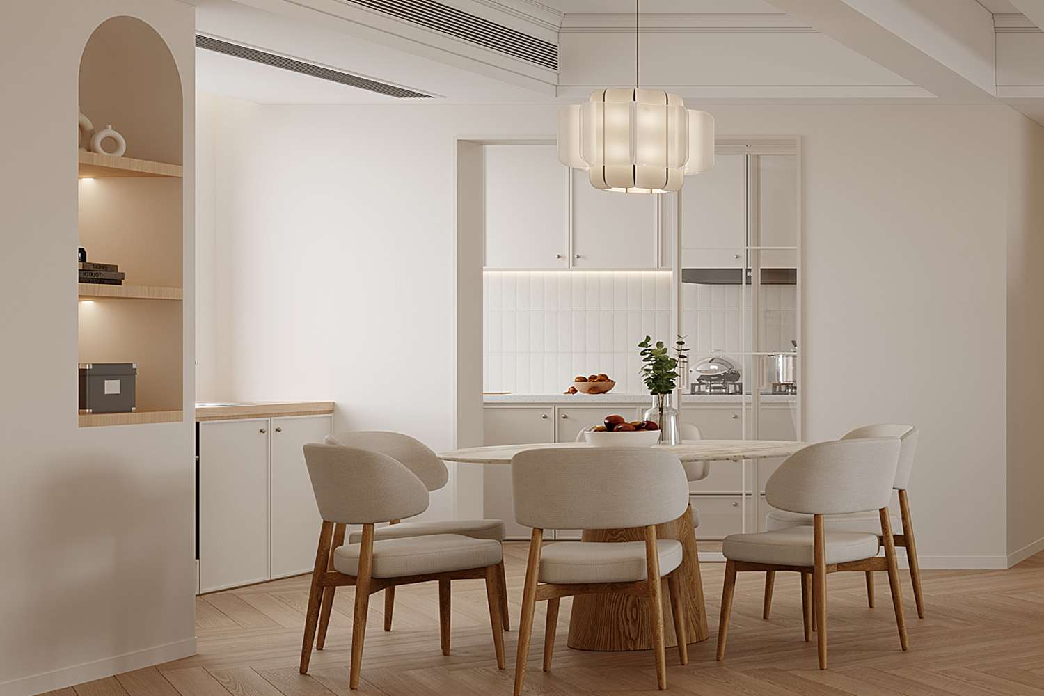 就餐區域借助白色與木色的碰撞營造一種自然的舒適美,鏤空式的儲物柜搭配上清新做舊的自然藝術掛件,典雅而又藝術感十足。