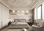 為了提升睡眠質量,臥室使用了相對較多深色色彩進行裝飾,深褐色的地毯、黑色的墻面,很好的營造了一種夜幕降臨的寧靜氛圍感。而白色的吊頂設計,則讓空間多一份清新韻味。