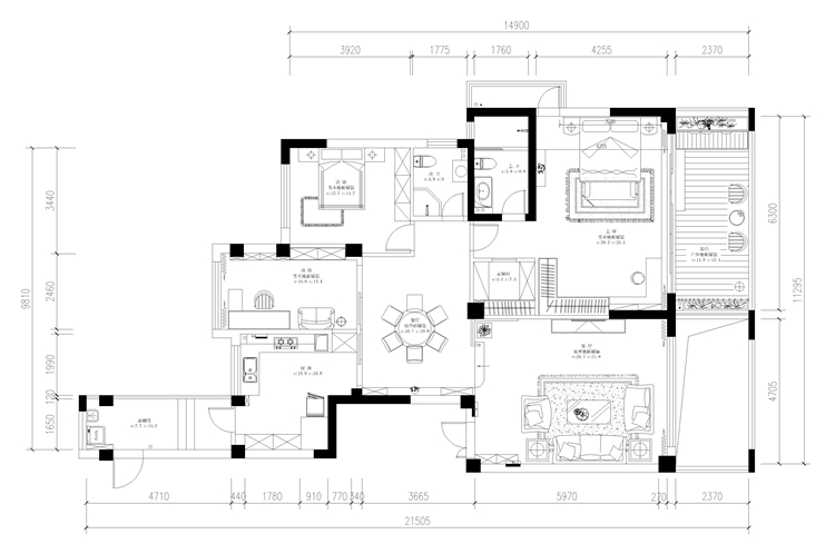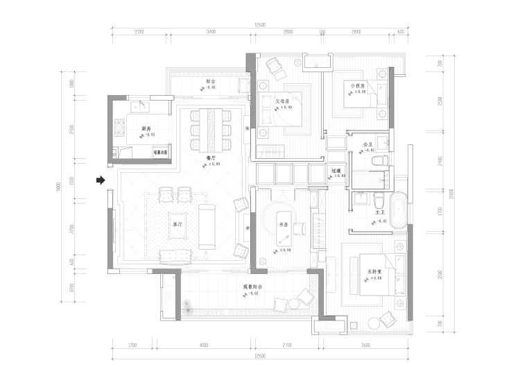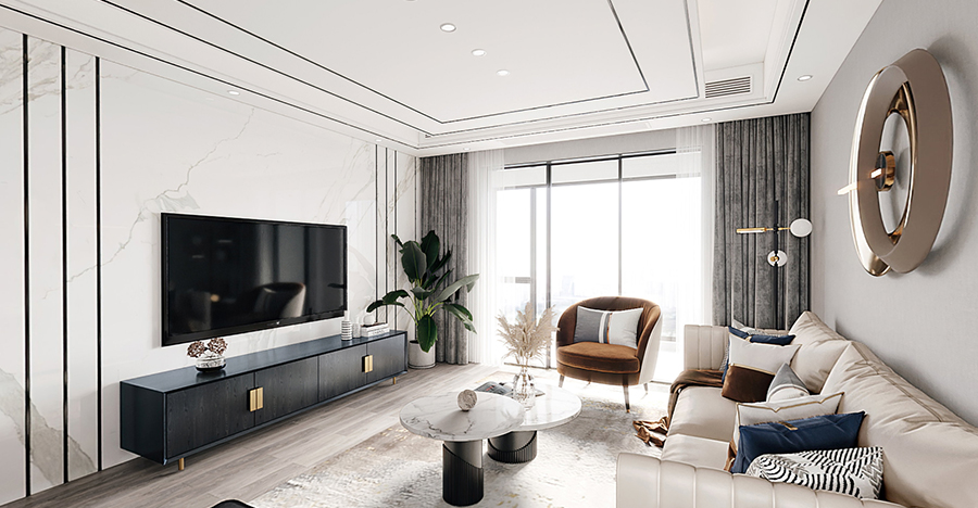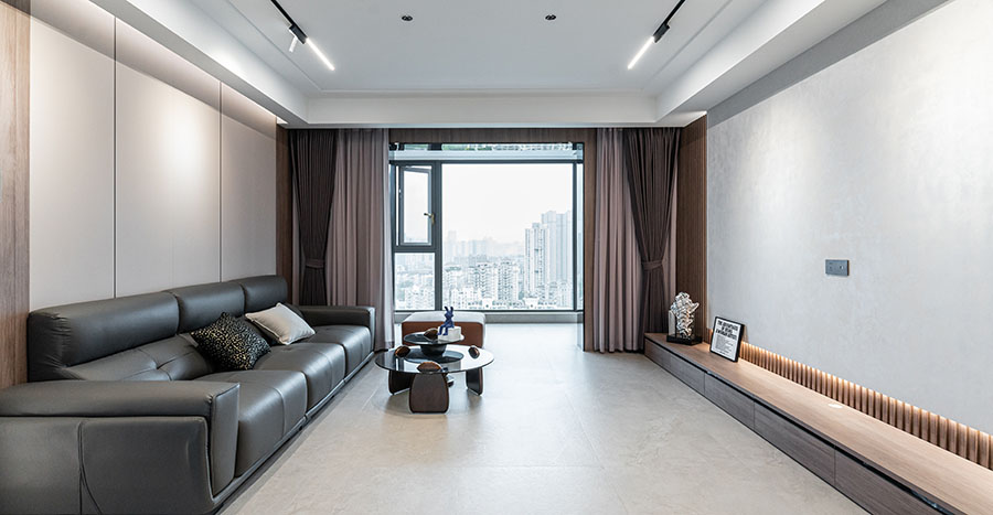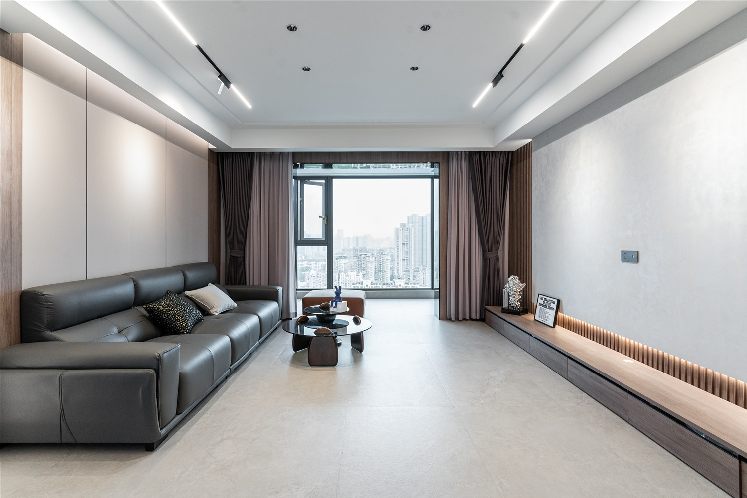 這是橡樹灣中一套160㎡的四居室,戶型面積中等,采光條件好,但內部分區較多,休憩區分區雜亂,需要設計出有邏輯的行動走線,這樣整體空間才具有設計感和時尚感。將餐廳與客廳中的非承重墻拆除,將兩個功能區合二為一,擴大了公共區域面積,使日常走動更為方便,以過道為中心,南北各分布兩個休憩區,日常生活變得更為舒適。