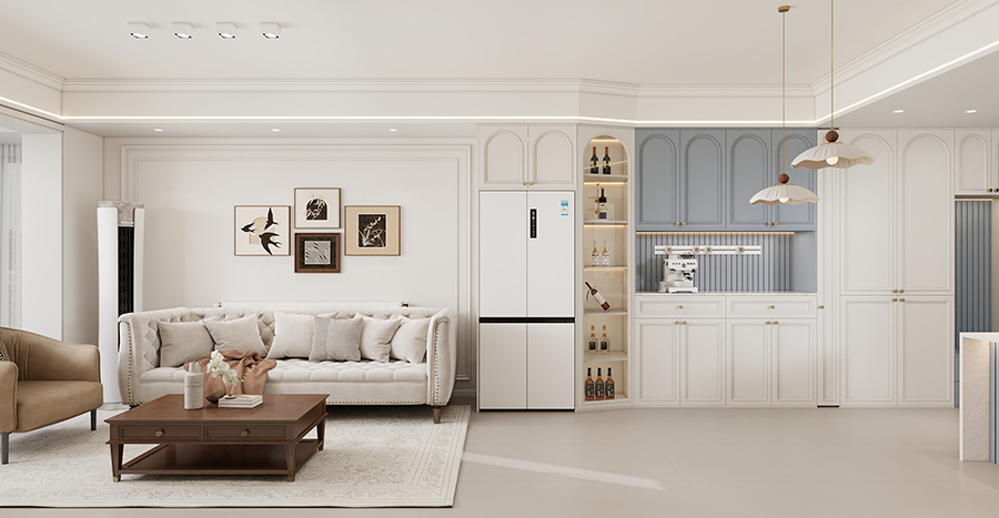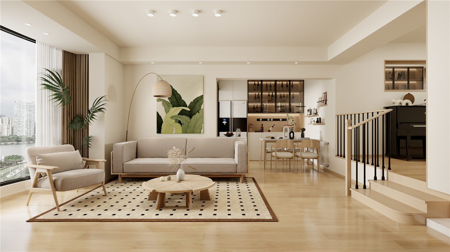客廳整體用色素雅潔凈,強調柔和溫馨感。大面積的落地窗則確保陽光能夠更好的進入會客區域,提升生活品質。