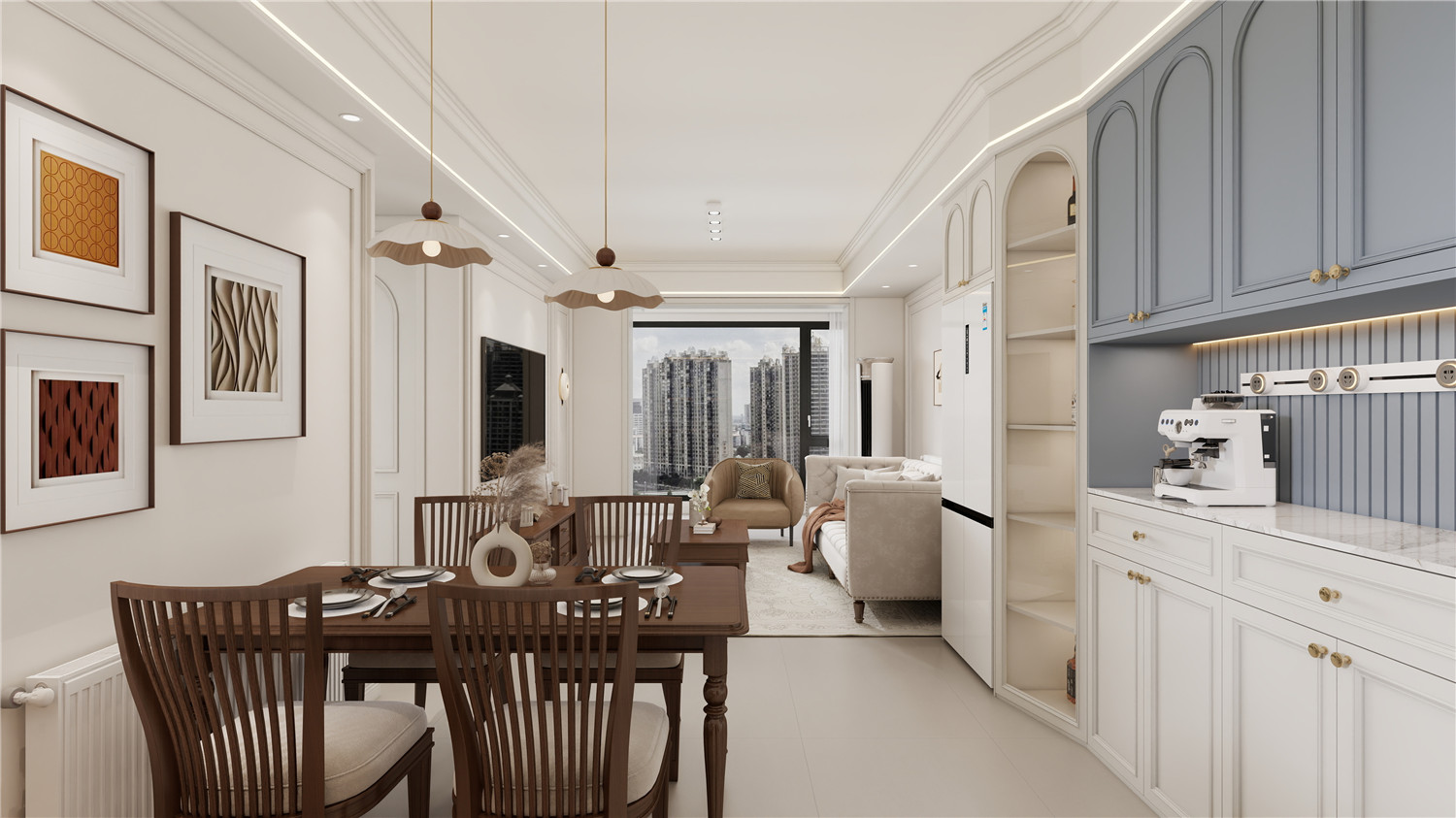 就餐區域設置在拐角處,同時借助簡單的餐桌椅與吊燈完成軟裝,強調實用性。