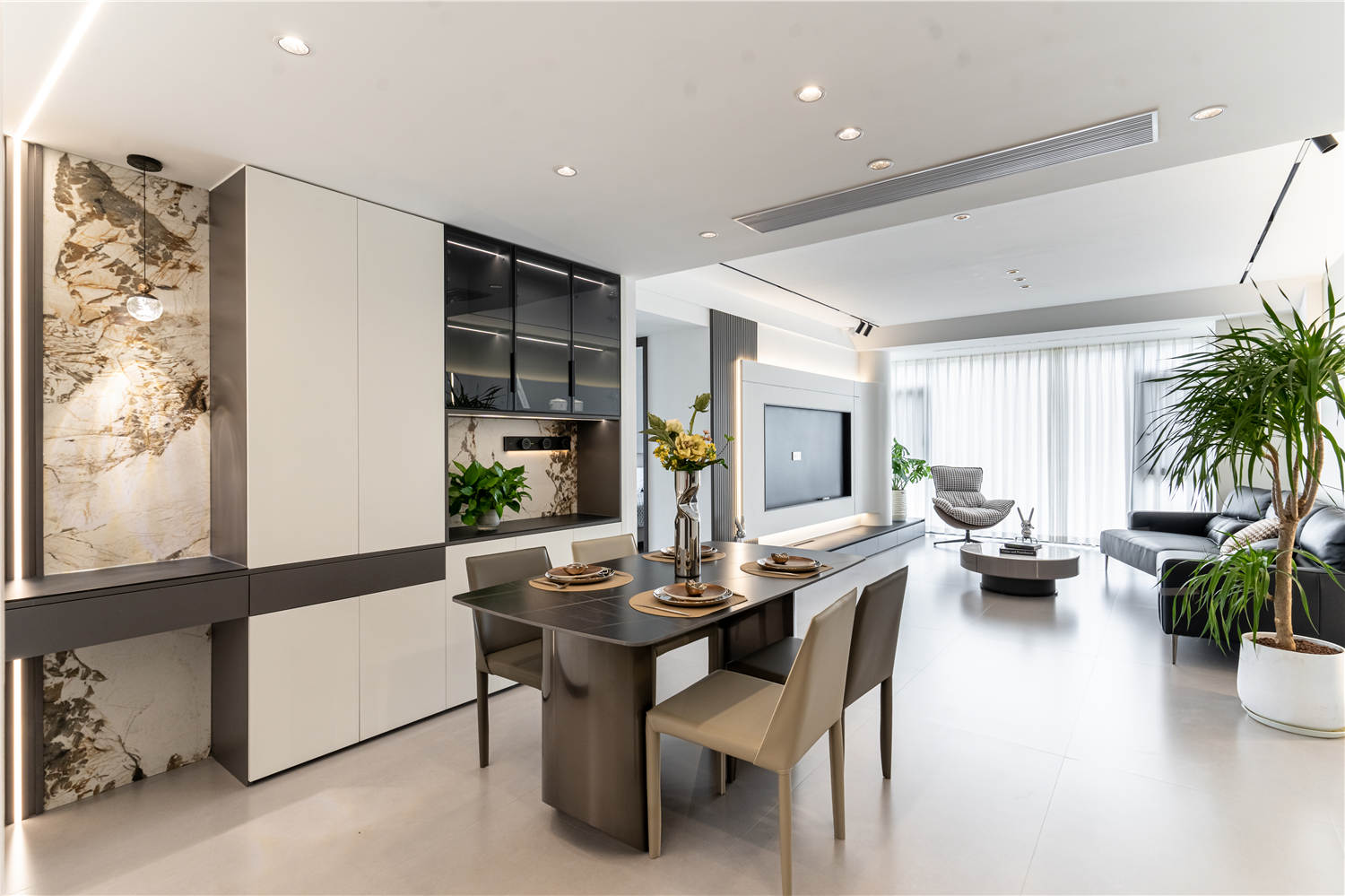 餐桌的另一側,矗立著真正的餐邊柜。白色柜體融合黑玻酒柜,黑白之間,有藏有露,盡顯簡約而不失格調的生活美學,實用與美觀并存。