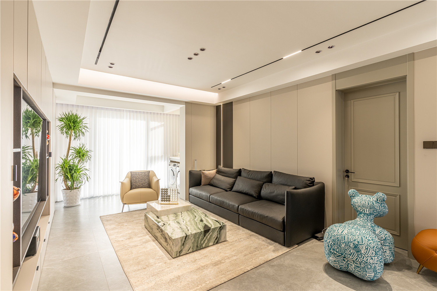 大面積的大理石瓷磚奠定了清冷通透的空間氛圍,搭配以質感溫潤的木材,有效提升了空間的視覺平衡感。