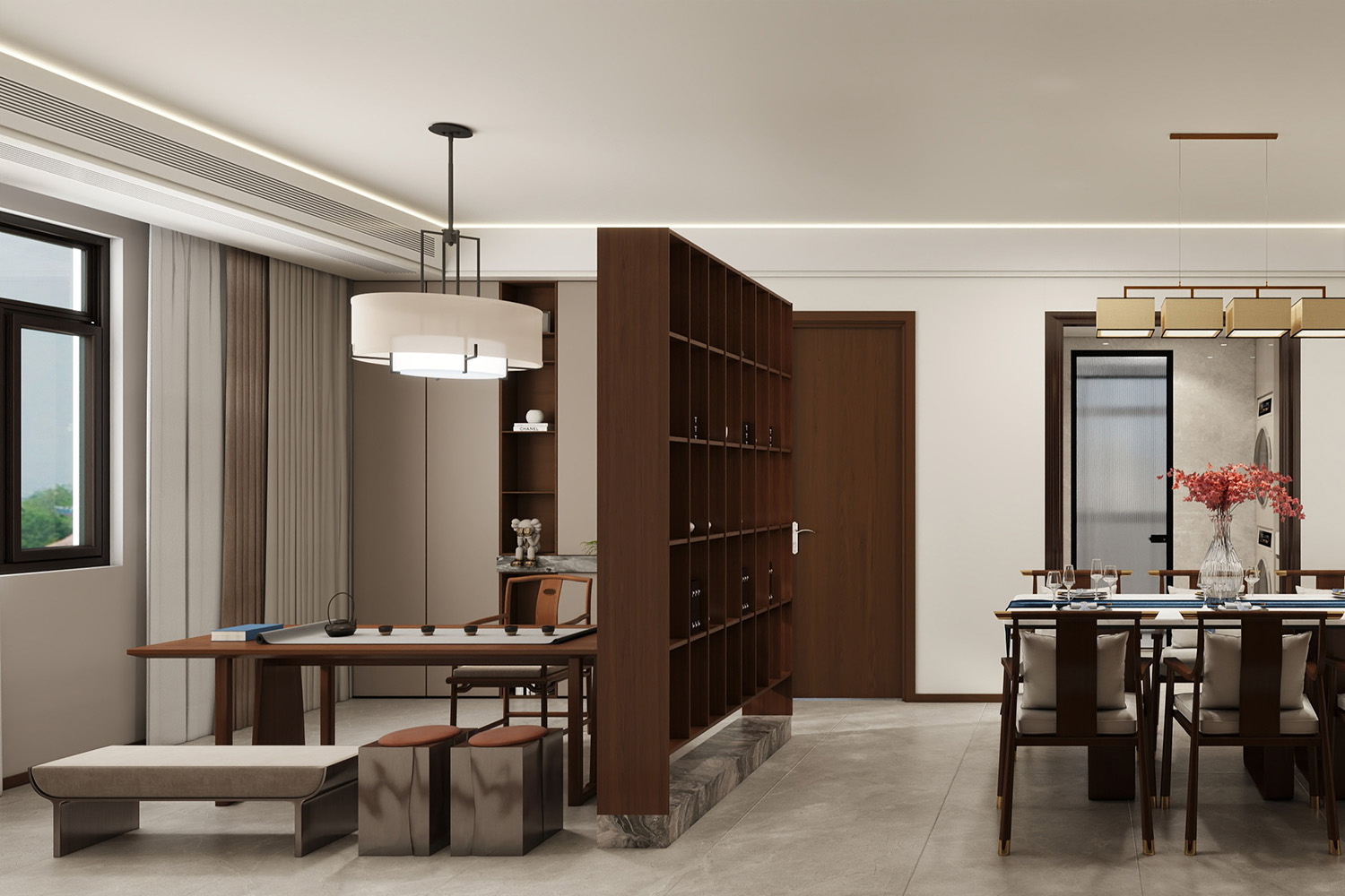 簡約木質仿古家具與現代時尚感濃烈的大理石背景墻之間的碰撞,呈現了宜古宜今的獨特時尚美。
