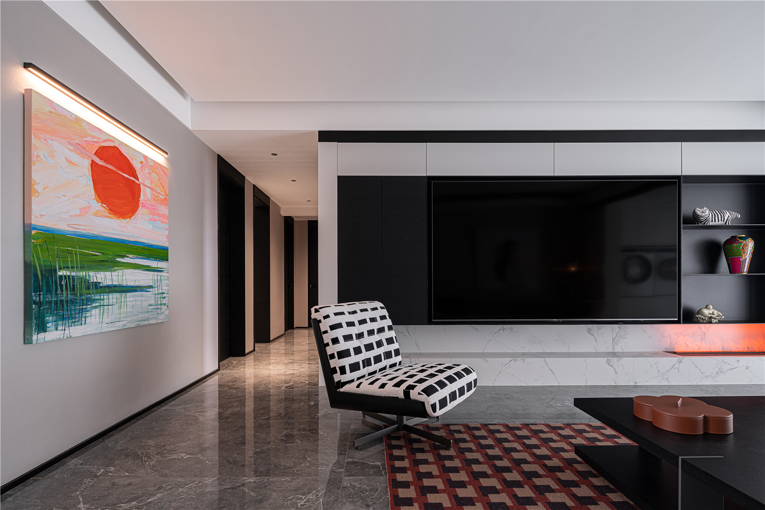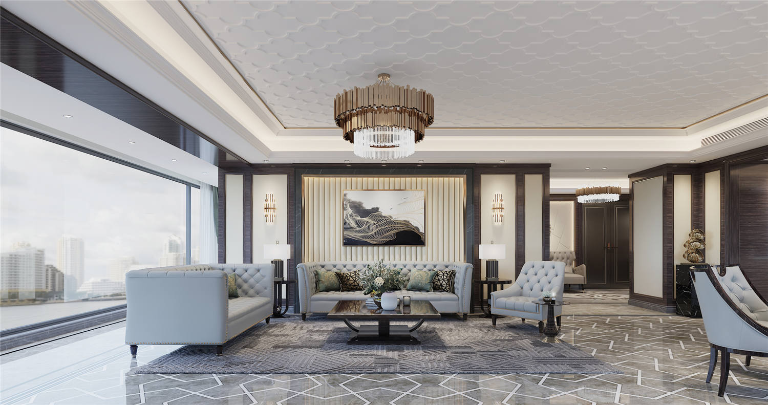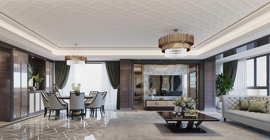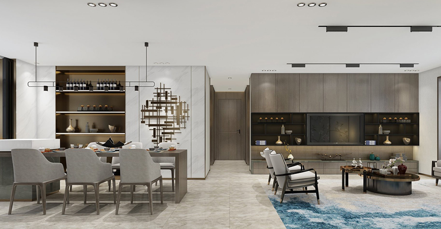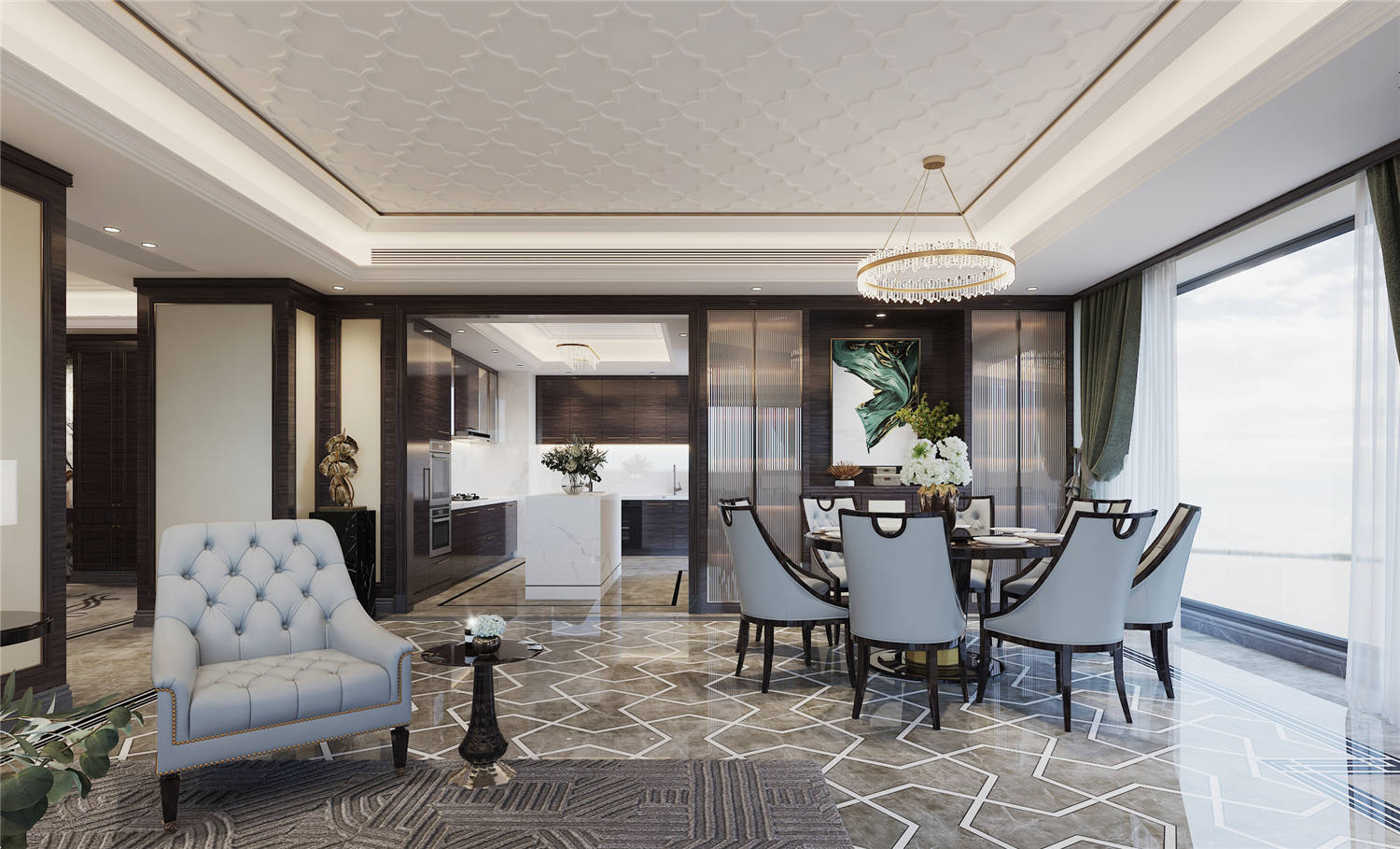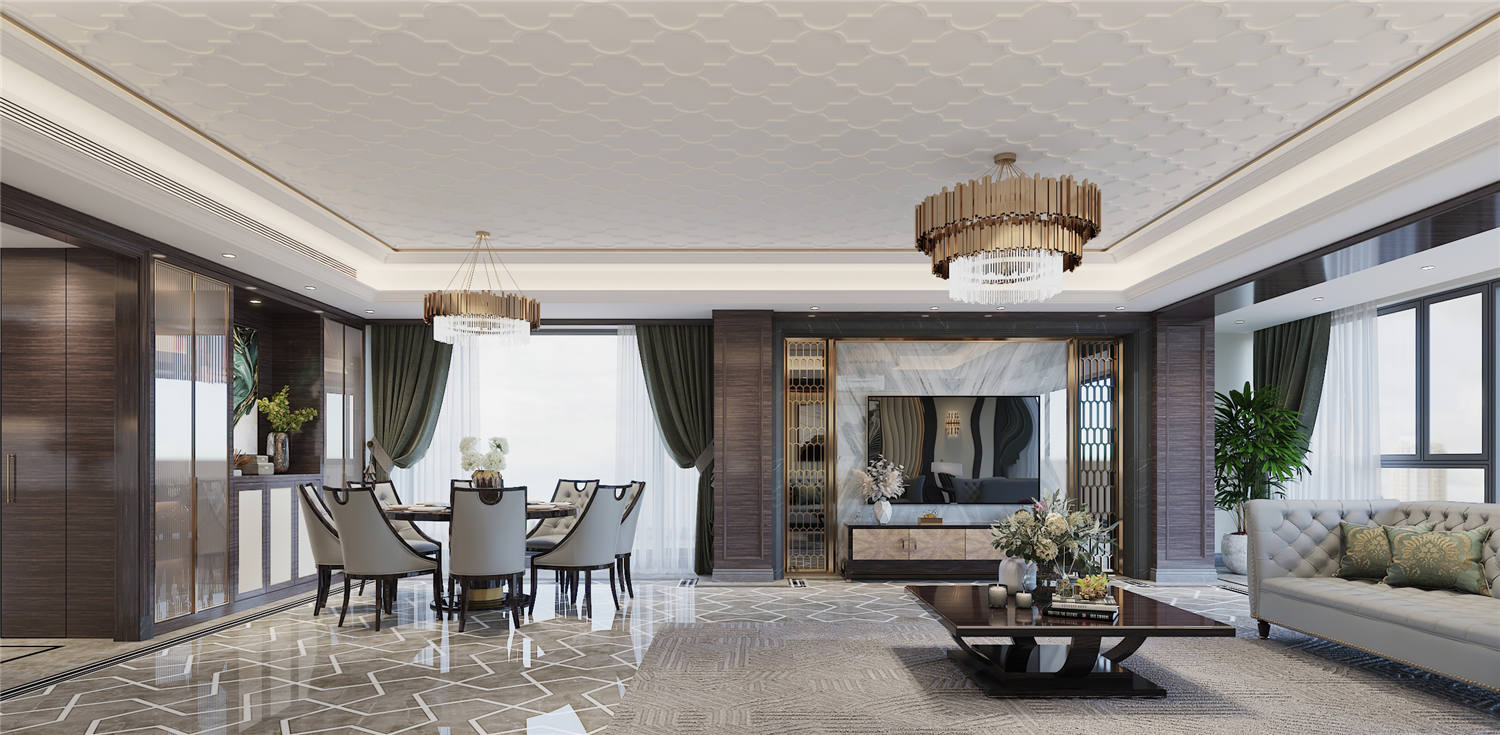 案例簡介:本案采用新中式輕奢設計手法來呈現,對原始戶型進行了局部的調整以來更加優化功能分區。整體色彩采用中性咖灰色系。材質采用復合石材及不免硬包、木飾面、天然石材、不銹鋼、乳膠漆等為主要材料。廚房利用隱藏式移門來滿足日常生活的各種場景。再設計和燈光以及質感為中心理念,圍繞宜居,舒適的生活環境為主導思想,從而呈現出業主滿意并且具備觀賞性及品位的居住空間。