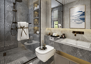 大面積瓷磚鋪設墻面,營造清新潔凈感,簡潔的復古山水畫則讓衛浴空間更好的融入整個家居空間中。