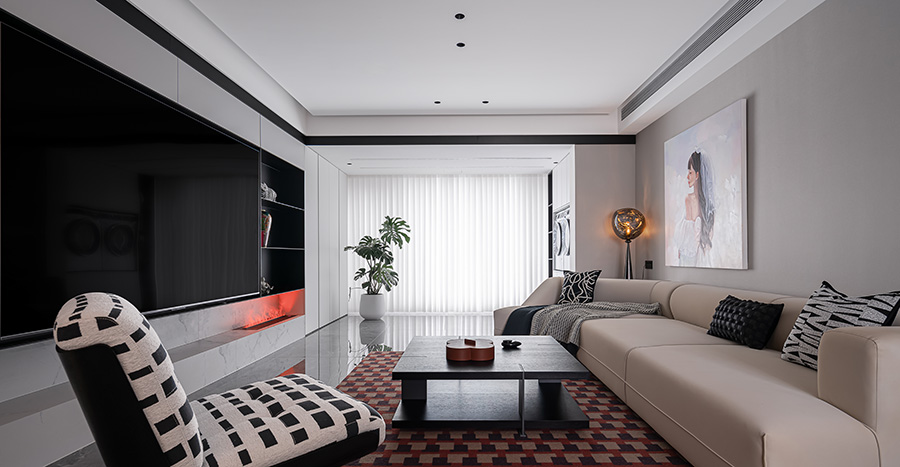 木質背景墻給人溫潤而又大氣的高級格調感,樓口式設計則滿足日常收納使用需求。