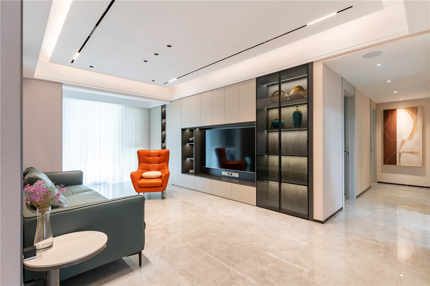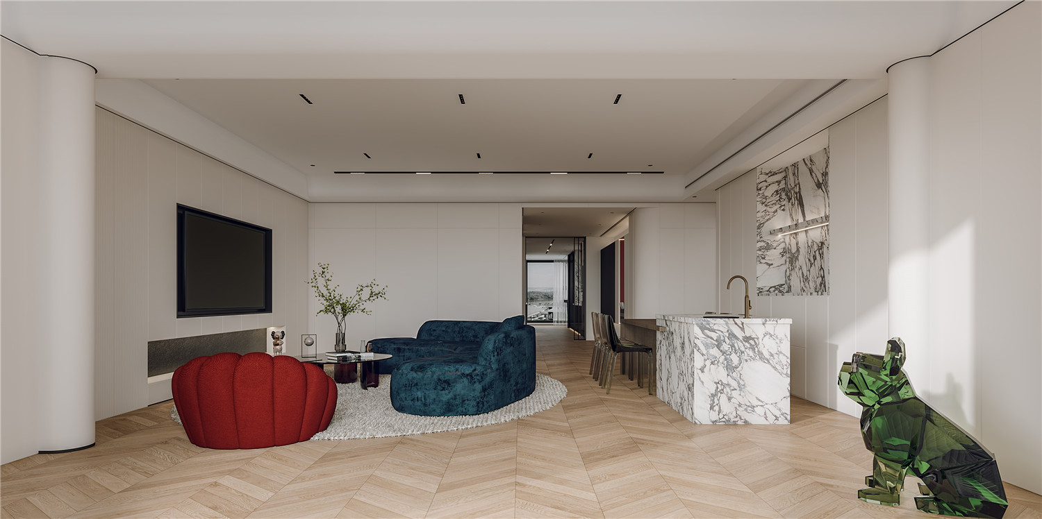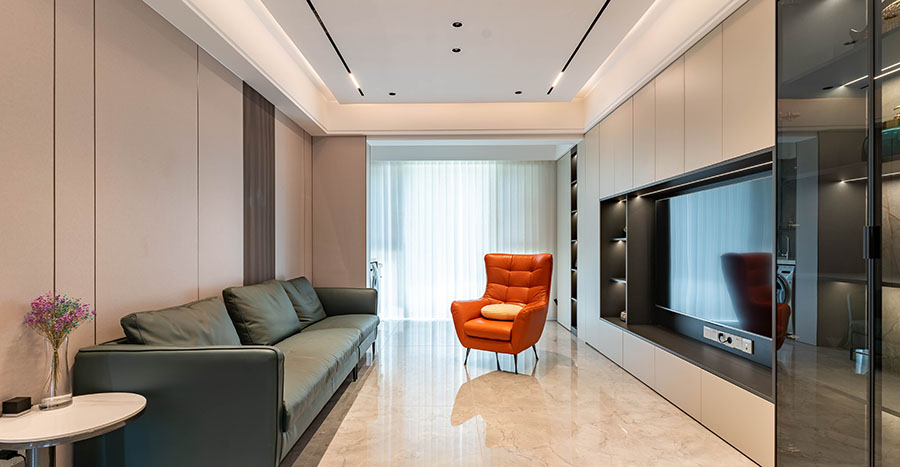大理石電視背景墻既可以起到裝飾點綴客廳的作用,又將客廳與外部空間進行軟隔斷,有效提升空間的界限感。