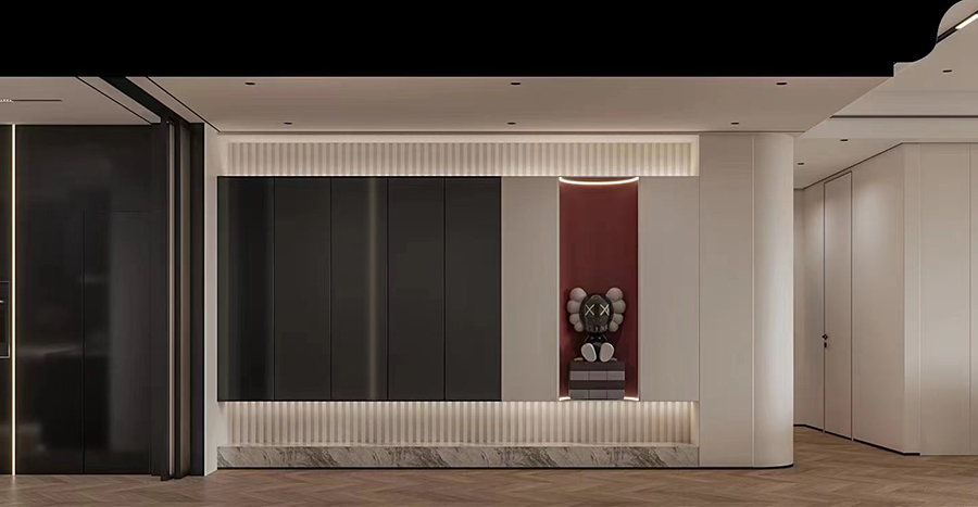 玄關區域借助木質置物柜簡約清新而又實用,滿足主人出入戶時的衣物放置、替換需求。