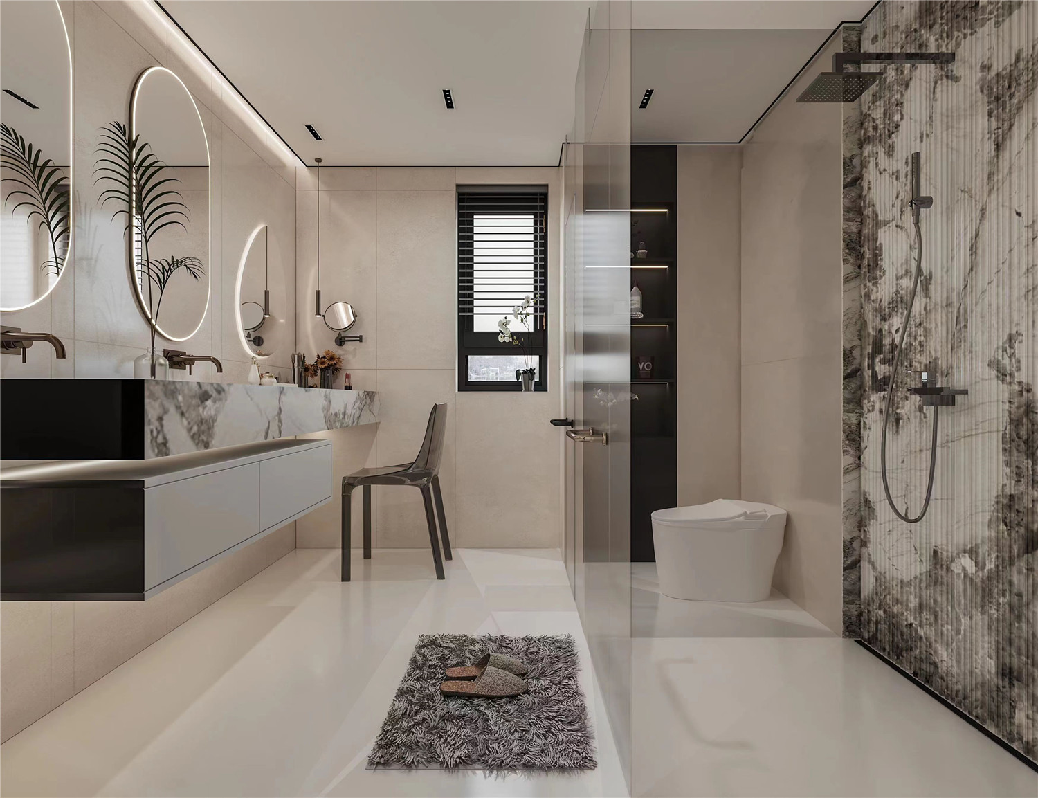 大面積的灰色暗紋瓷磚低調又耐看,搭配以裸方形瓷磚,強調區域實用性。