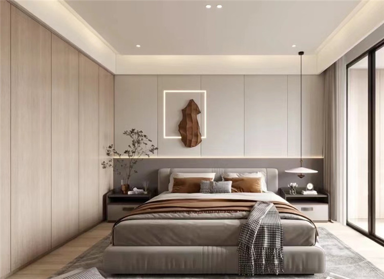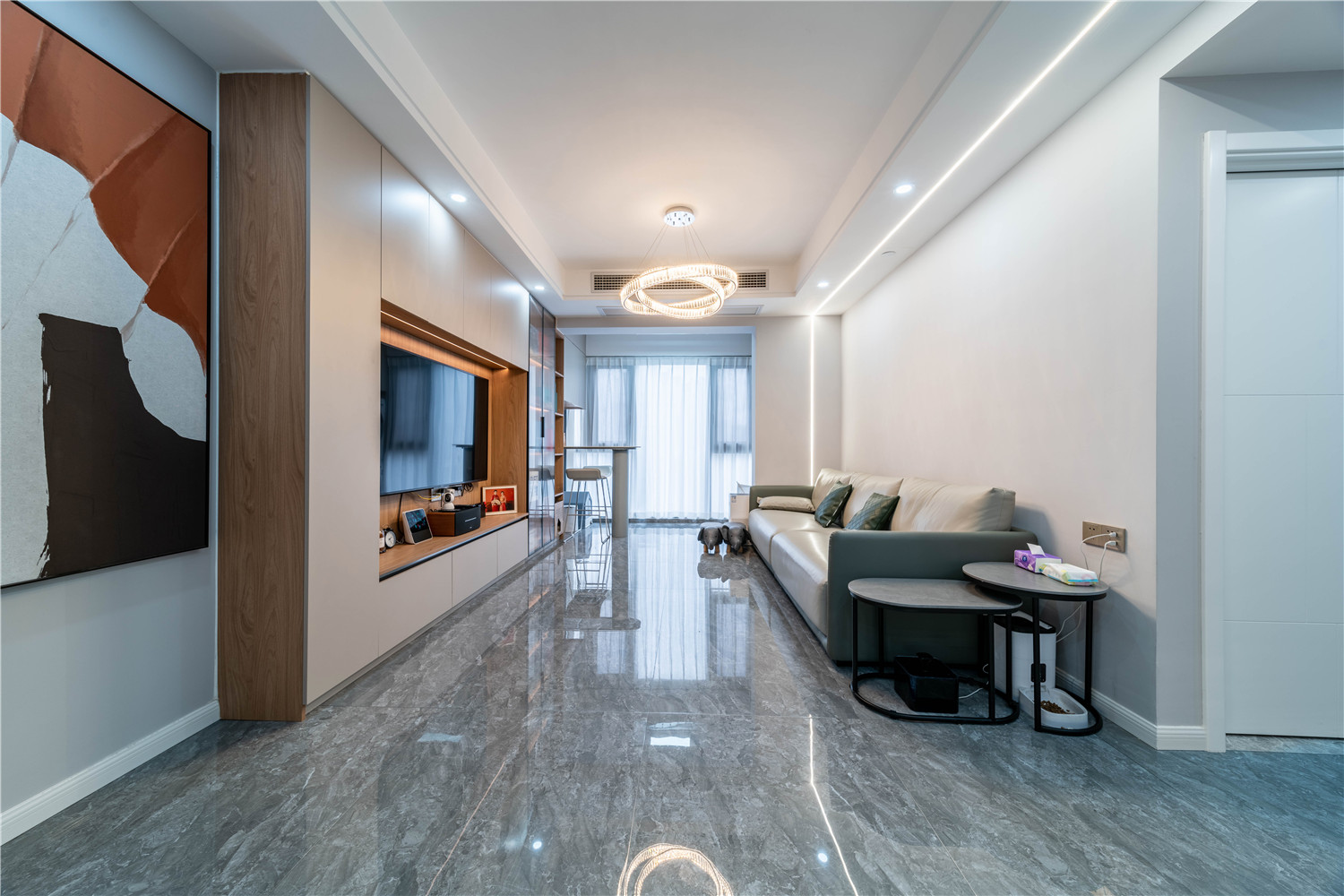 案例簡介:本案設計以線色調為主,線性燈點綴面,胡桃木的穩重色調進行搭配。沙發、燈具及軟裝的陳設,充分展現通透空間的所派感。以縱向穿插呈現空間的力度之美,展示美學點、線、面的特點之美,模糊空間界線、材質界線,造就層次流轉的界面語匯,盡顯空間魅力。作為新人的婚房而言,完全符合了現代人的審美需要。