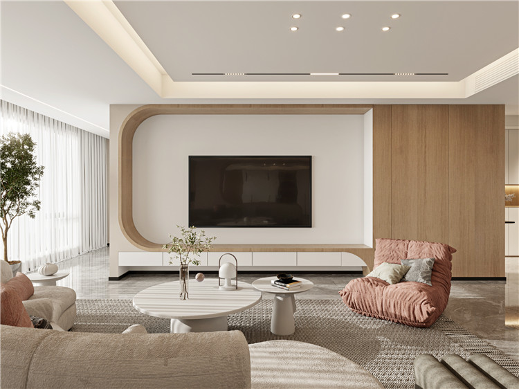 獨特線條的背景墻和現代的家具搭配很時尚,淺色調的客廳溫馨舒適。