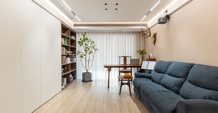 灰色線條的設計和灰色的沙發相映成章,客廳內的書柜彰顯了家庭的文化氛圍。