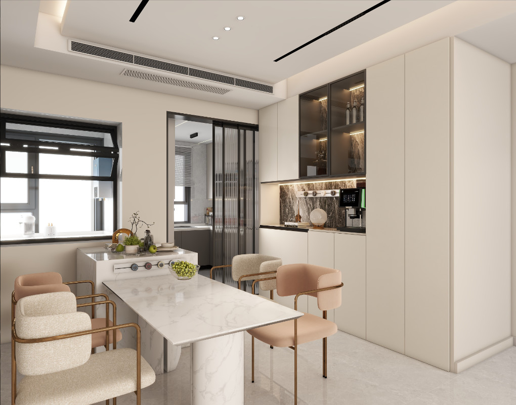 大面積的大理石背景墻與白色水泥墻相得益彰,既不會過于突兀又能夠提升空間品質格調感。