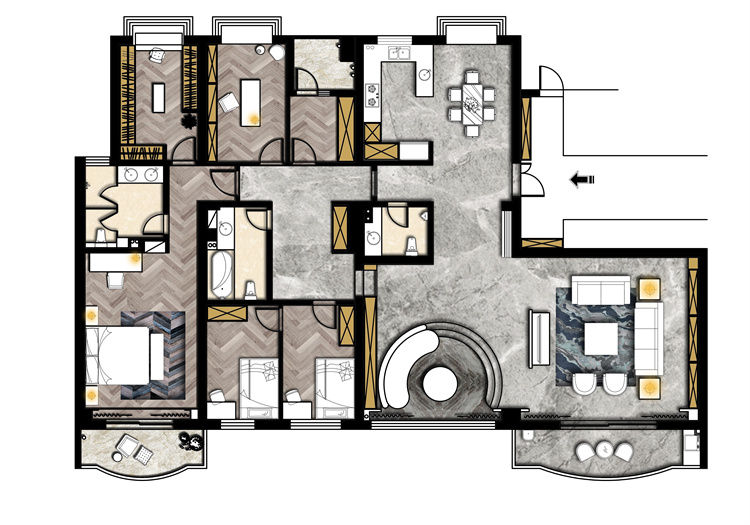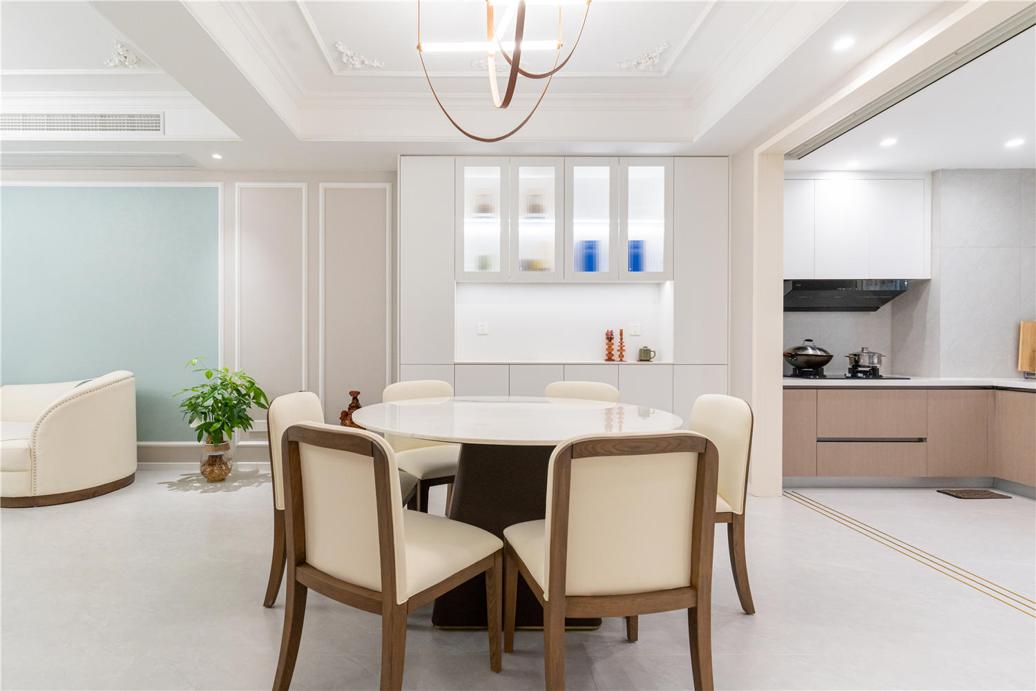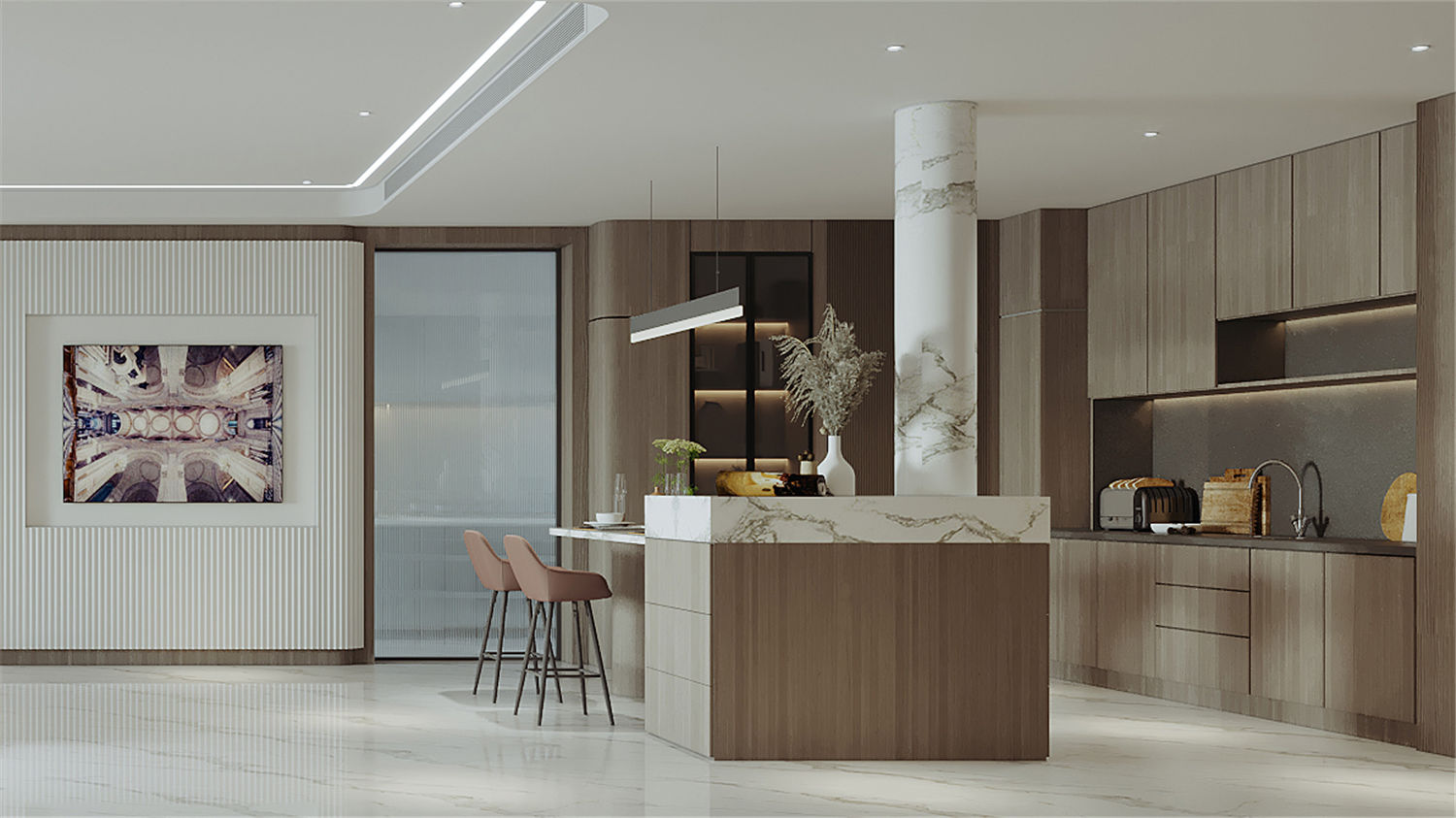 怡景花園這套四居室的住宅面積約為175㎡,原有的戶型結構只是進行了簡單的功能分區,并不能滿足業主一家四口的起居使用需求,因此設計師將其中一個大的空間隔成兩個小臥室,滿足兩個孩子的日常起居使用。而為了提升生活品質,設計師利用入戶走廊做軟隔斷,將其中一部分區域打造為廚房與就餐區域,另外一部分則設計為客廳,以提升空間的合理性。