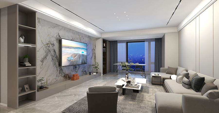 客廳配色溫和舒適,地面鋪以大理石裝飾,沙發(fā)觸感相當(dāng)柔和細(xì)膩,讓整體看起來十分富有質(zhì)感;電視墻的設(shè)計(jì)恰好呼應(yīng)了客廳風(fēng)格,增加了空間的時(shí)尚感;陽臺(tái)空間增設(shè)了收納柜和辦公桌椅,起到一定的延伸作用。