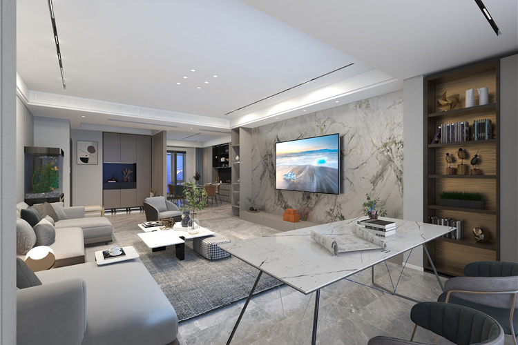 客廳當(dāng)中以大地系配色為主,灰色大理石與沙發(fā)相互點(diǎn)綴,在軌道燈的相互映托下,整個(gè)空間變得更加溫馨低奢。