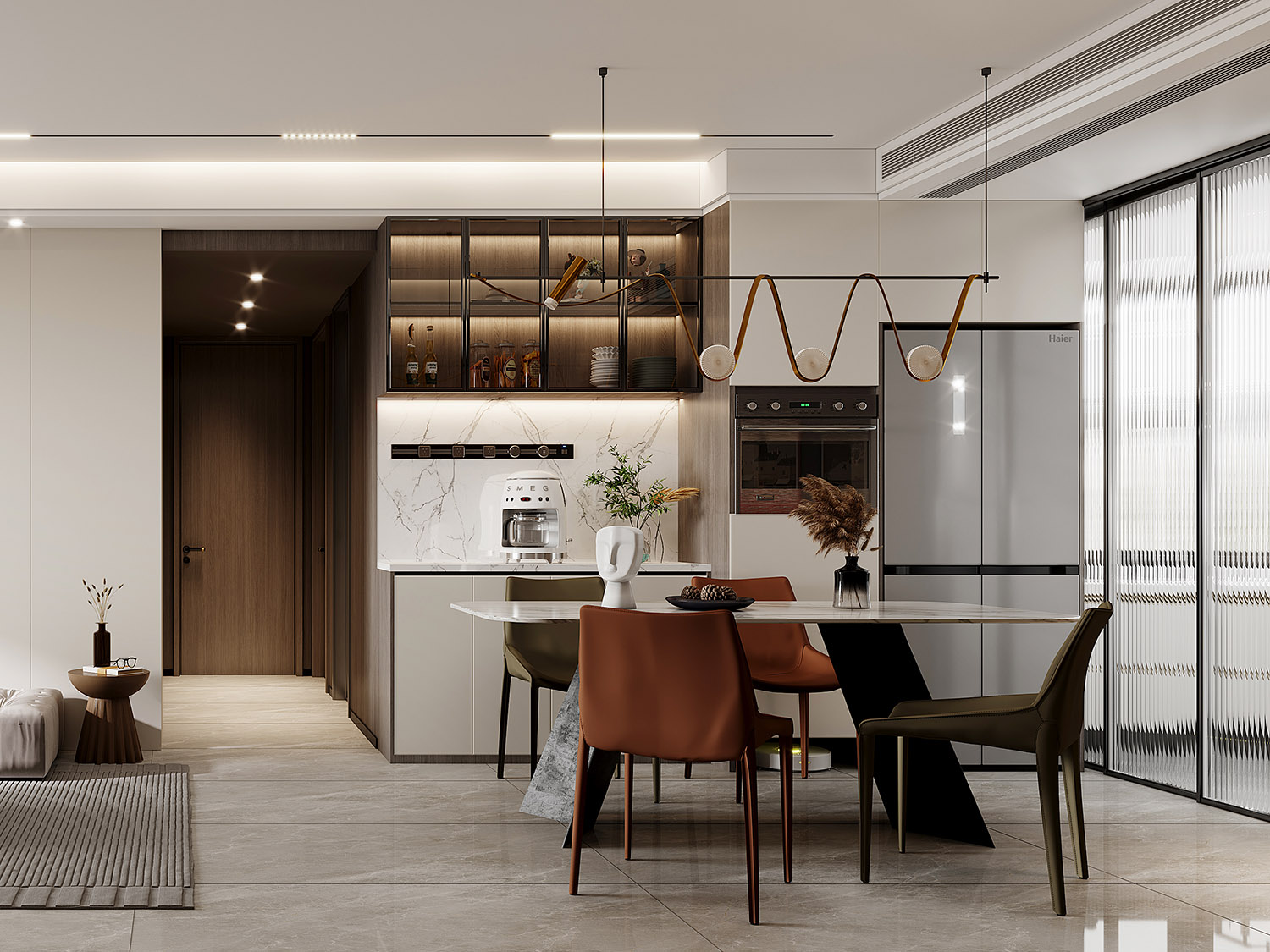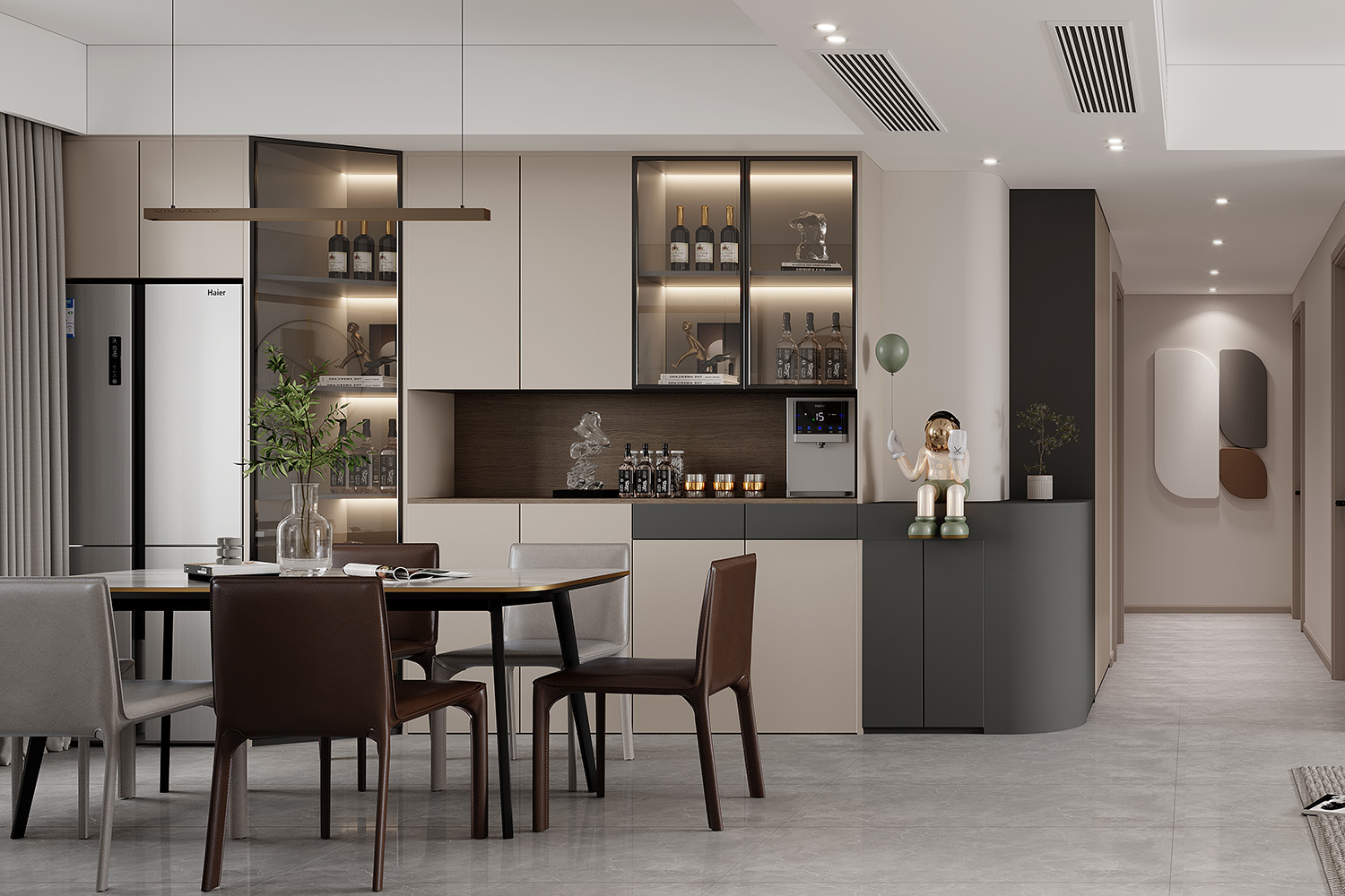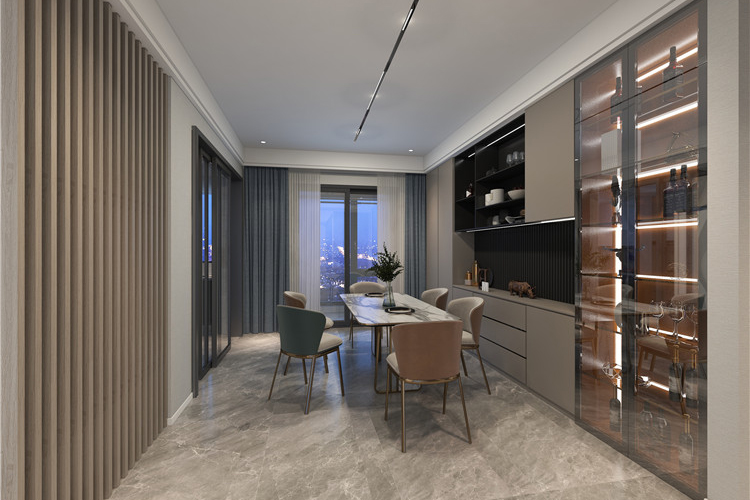 餐廳采用無主燈設(shè)計(jì),頂面以軌道燈和筒燈為主,無形中拉升了空間的層高,背景墻看起來非常簡潔,餐邊柜收納功能強(qiáng)大,美觀與實(shí)用性兼具,燈帶的鋪貼給人帶來一種舒適的感覺。