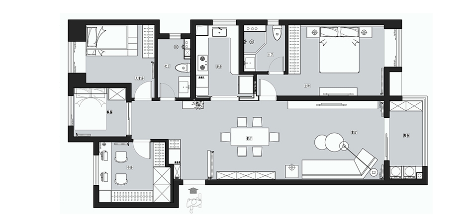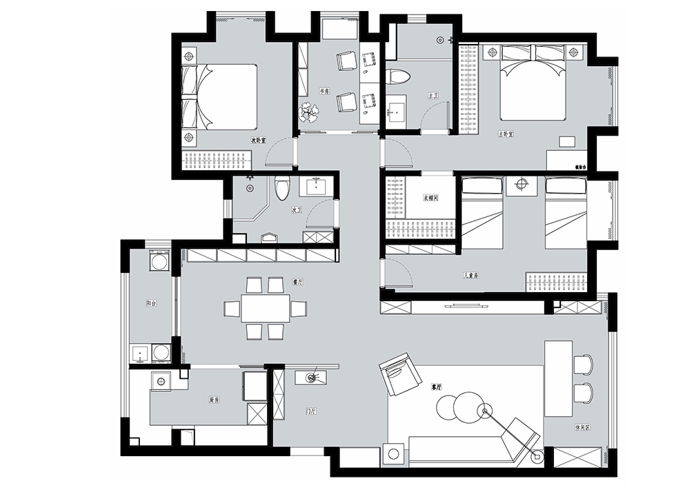戶型結(jié)構(gòu)簡單,橫廳設(shè)計(jì),餐客的空間利用率能得到提升,客廳與陽臺(tái)相連,拓展了空間功能,令空間的采光變得更好;主臥攜帶衛(wèi)生間,提升了私密感和舒適感,兒童房、客房和書房集中分布,動(dòng)靜規(guī)劃得當(dāng),空間利用合理。