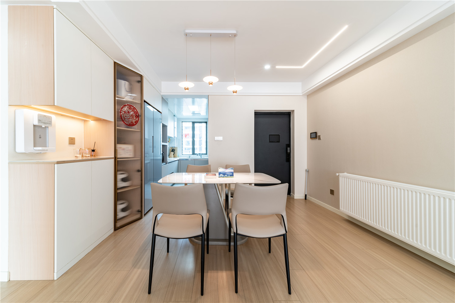 荷景苑這套128㎡的四居室住宅整體戶型四平八穩,而空間結構上,入戶處的面積相對比較寬敞,如果僅僅用來做玄關相對比較浪費,因此設計師將該空間分隔成兩個區域,其中一塊設計為廚房,以提升空間的利用率。主臥區域則與其中一個衛生間空間進行銜接融合,提升主人起居生活的便利度。