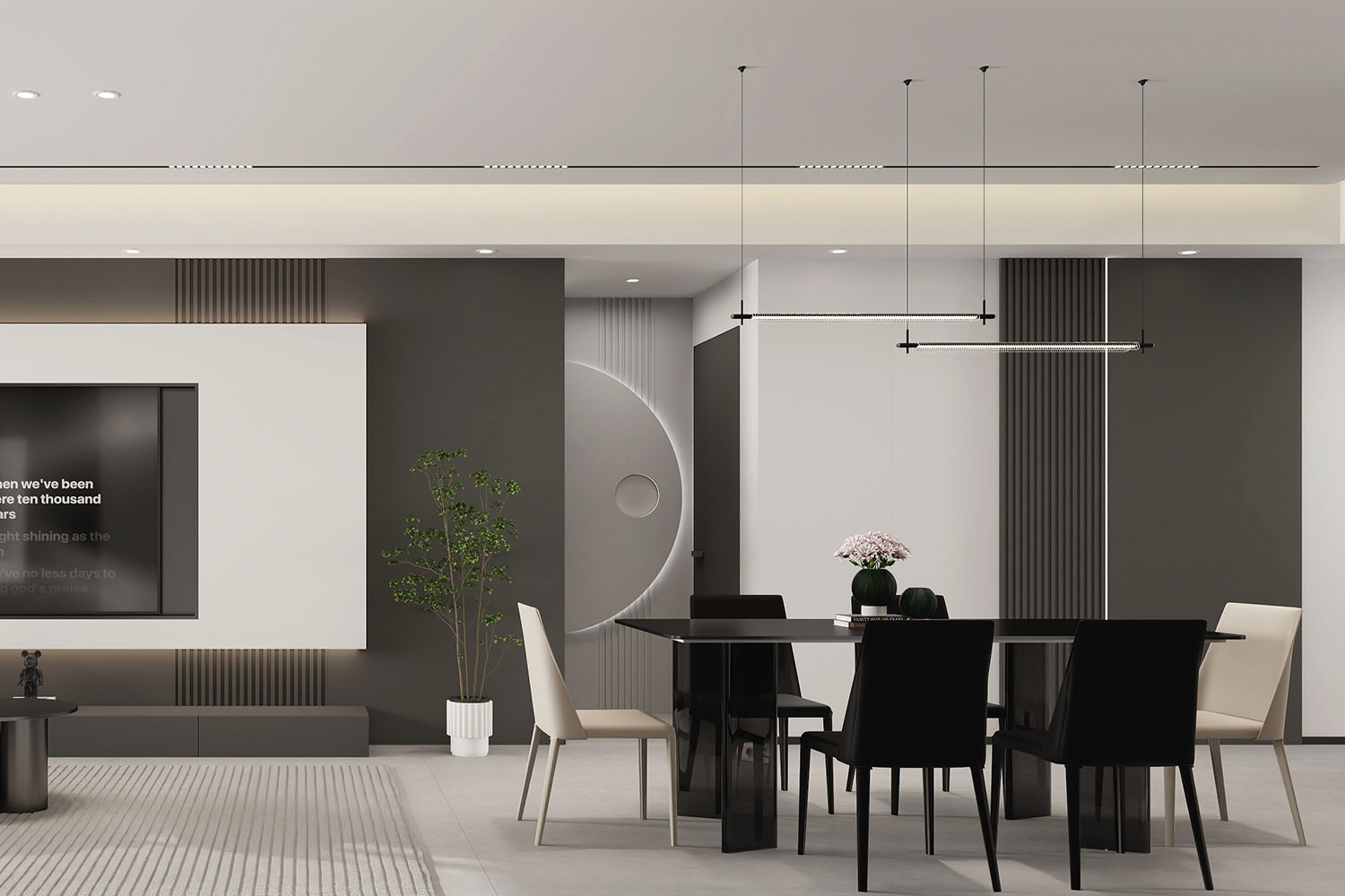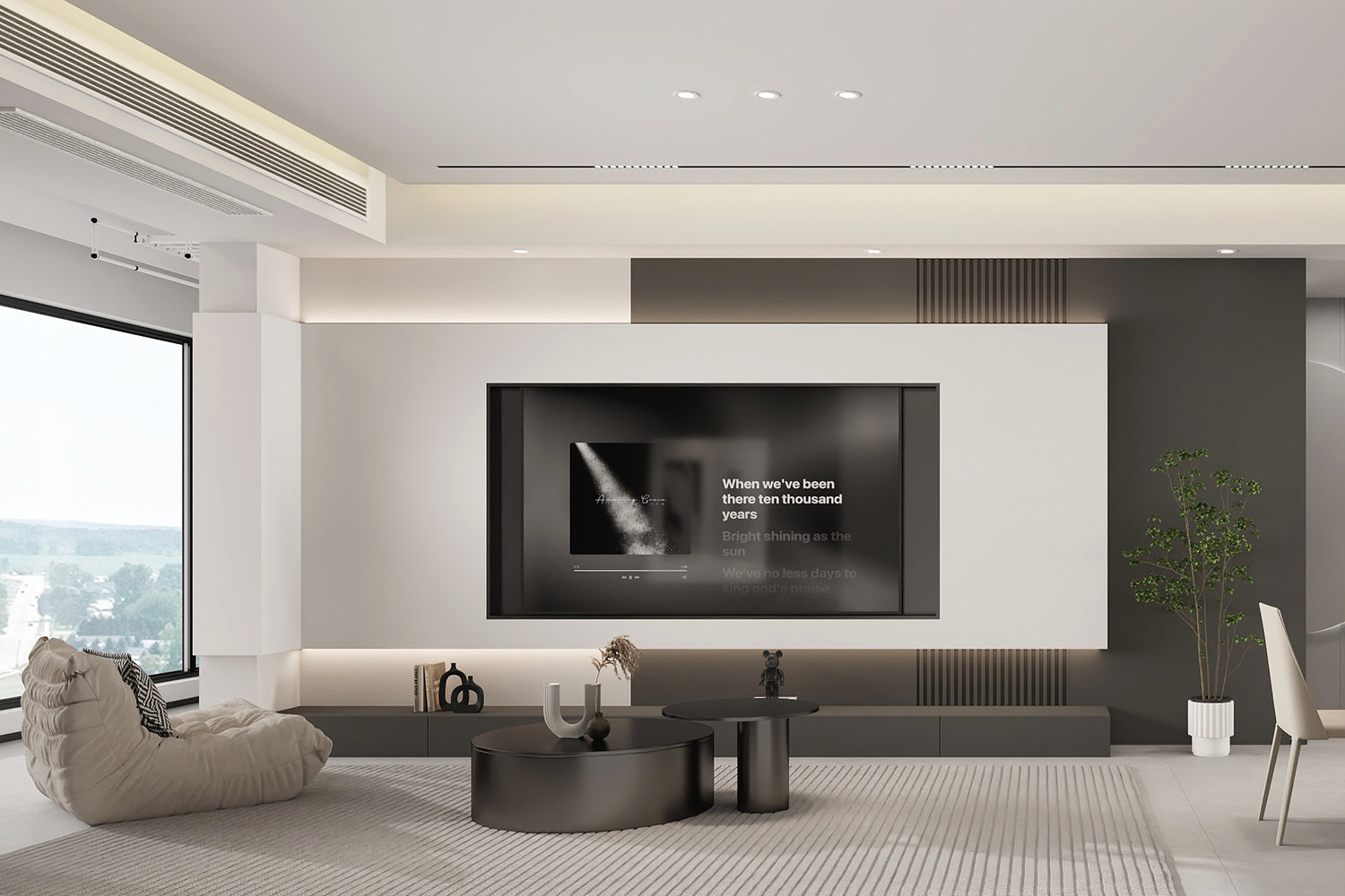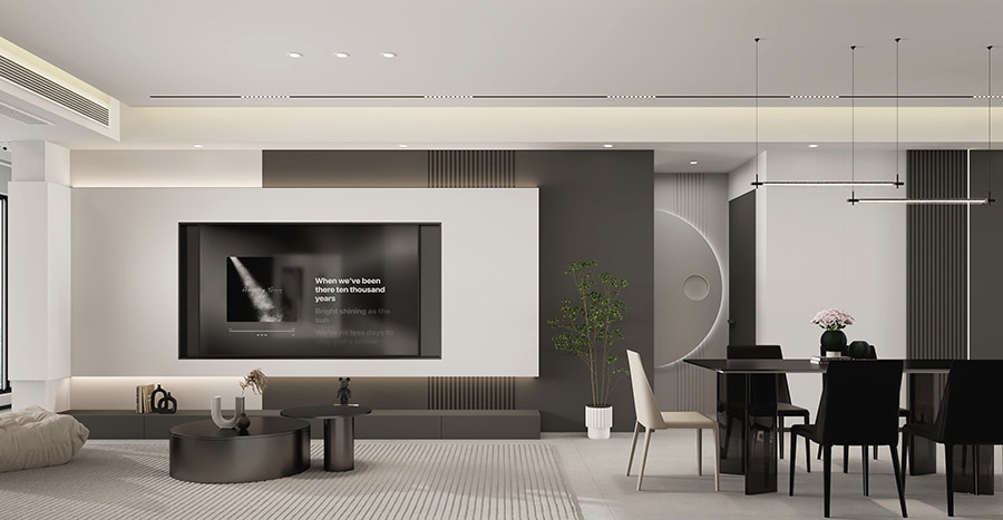 由木質與大理石材質打造的電視背景墻清新而又不失理性,鏤空的設計則讓空間的通透感更加強烈。