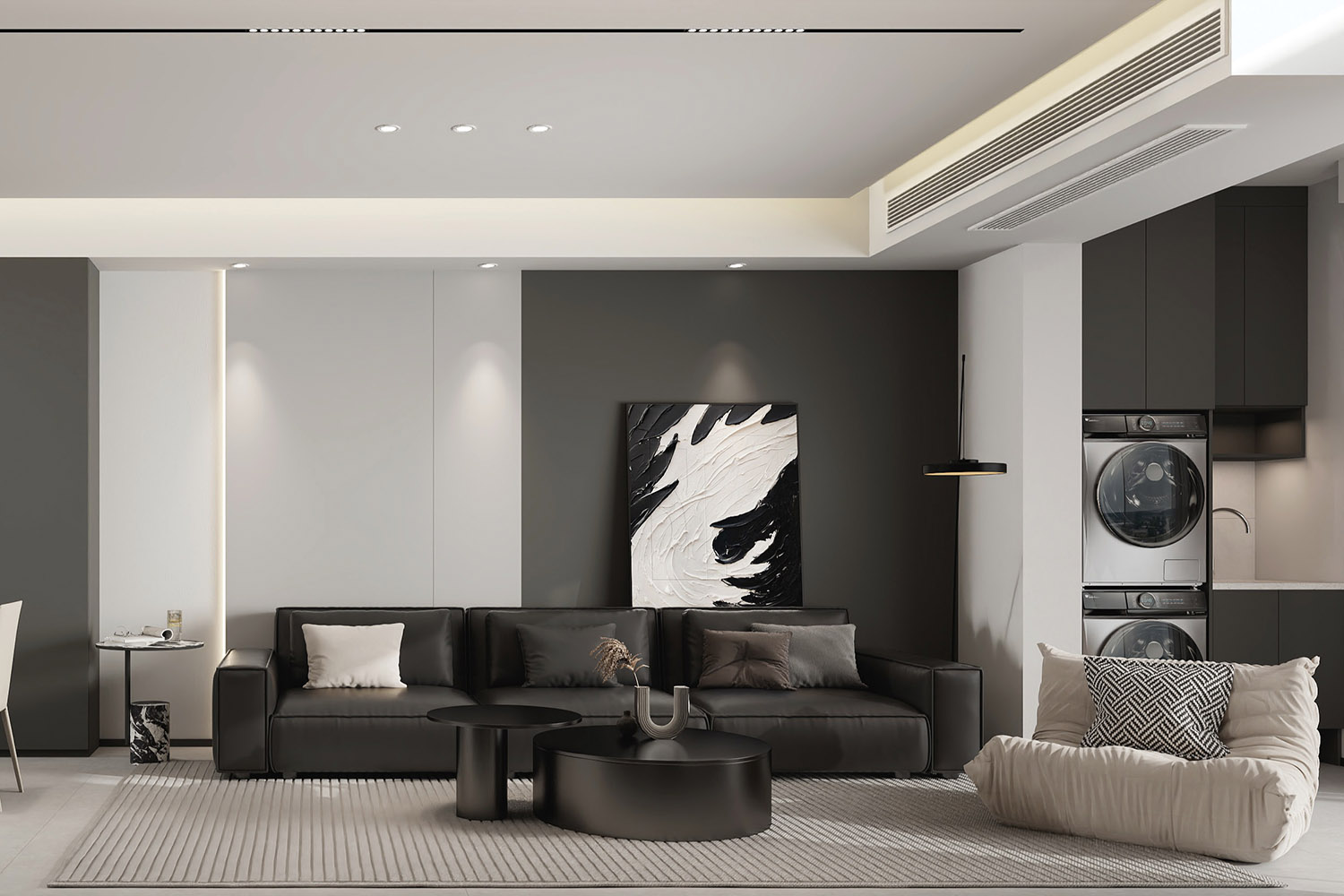 玄關處借用遠處墻面的藝術畫作為點綴,同時側面由白色櫥柜進行裝飾,強調實用性。