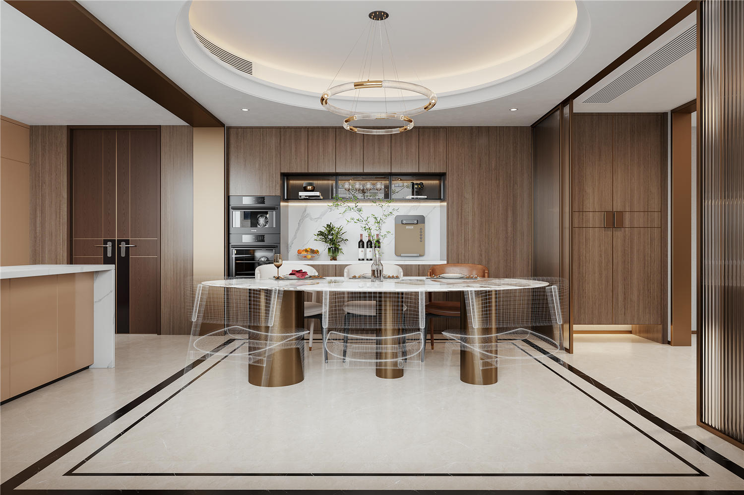 2    餐廳與客廳之間采用可開可合的玻璃門隔斷,合上時隔絕油煙,打開時空間互聯。
