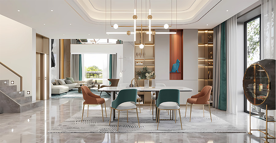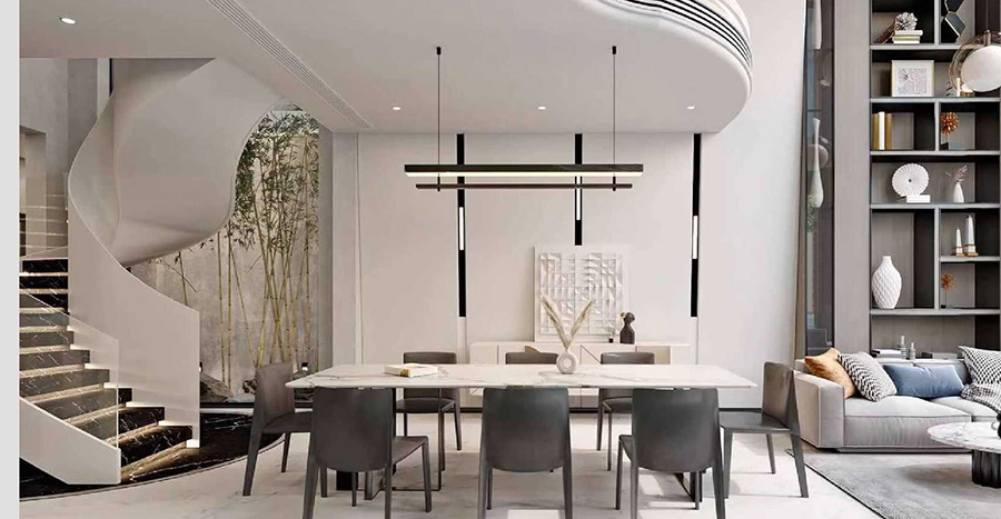大面積的白色點(diǎn)綴上色彩明快的黃色沙發(fā),一種跳躍而又清新的浪漫之感呼之欲出。葉子形狀的燈飾、簡約的小綠植則為會(huì)客區(qū)域增添了一抹自然美。