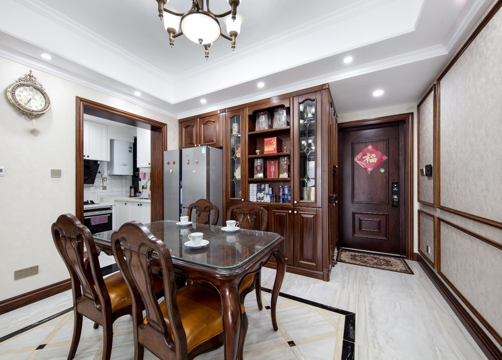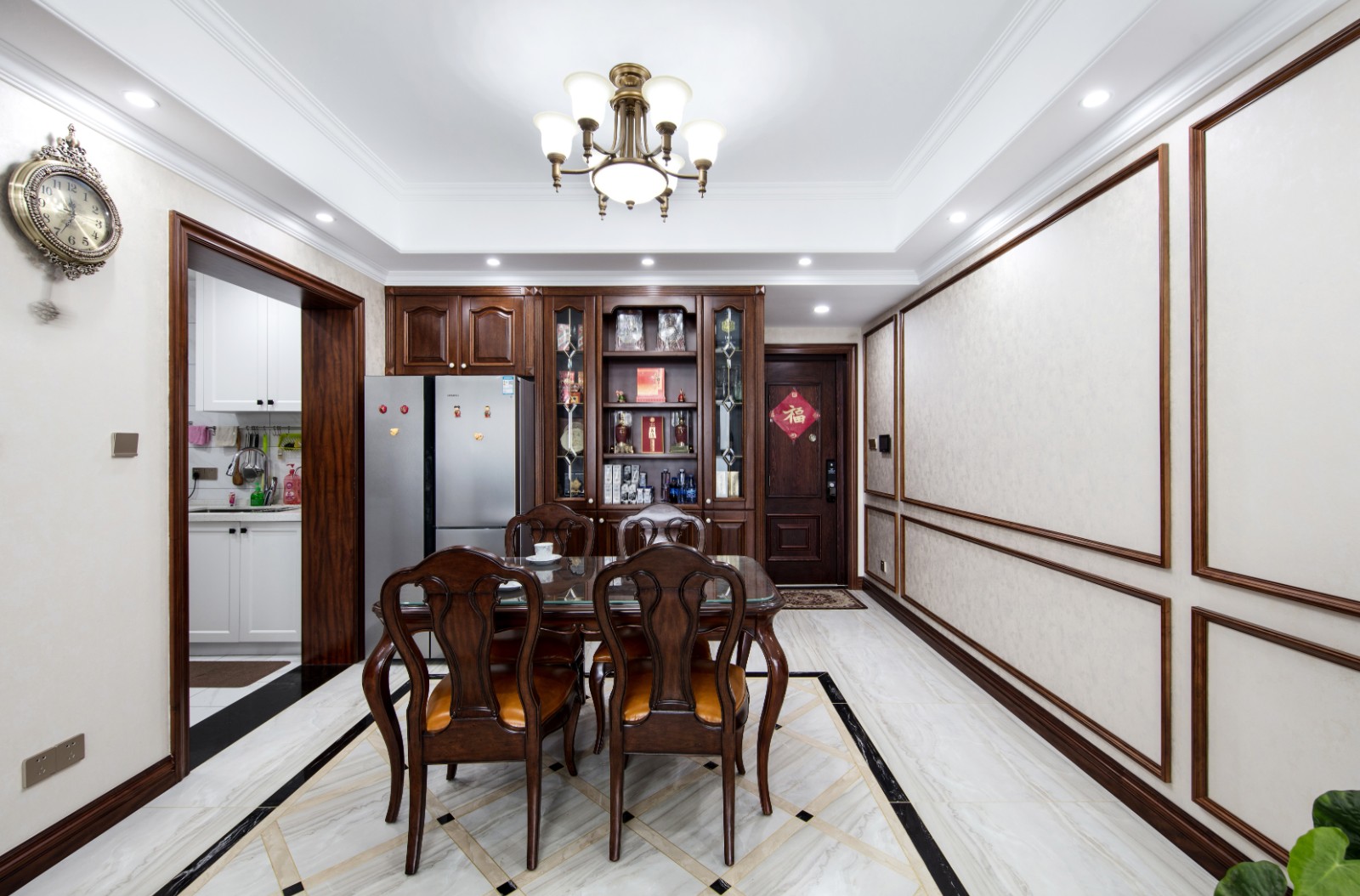胡桃木家具搭配上造型簡約的吊燈就構(gòu)成了就餐區(qū)域的軟裝,整體造型簡約而又耐看,同時不會占用較多空間。