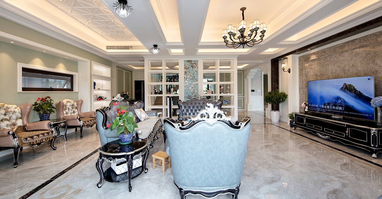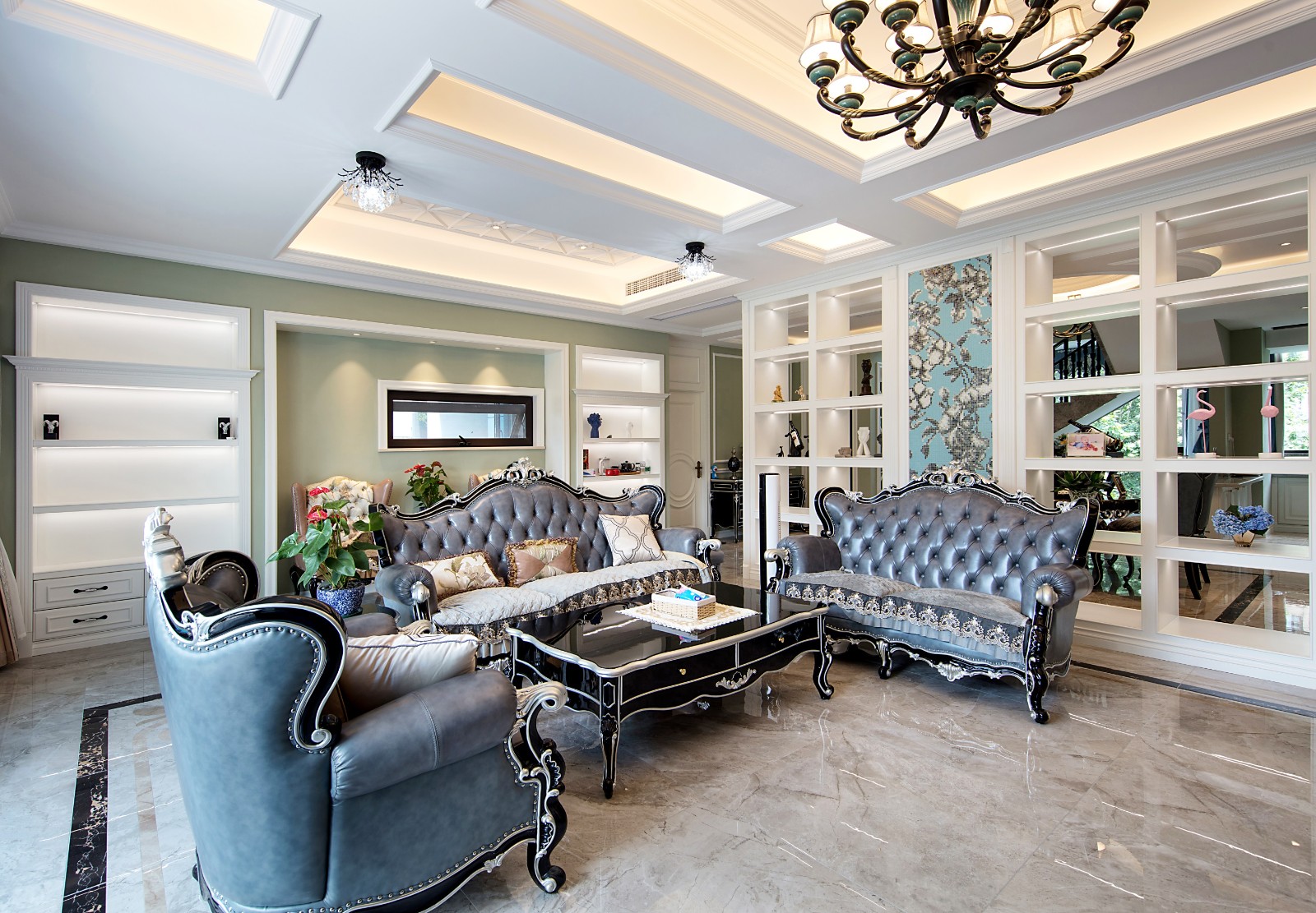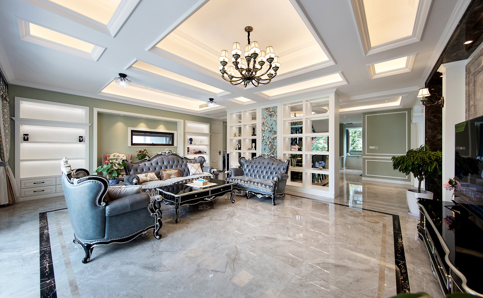 客廳則利用家具的造型來營造一種典雅高貴的品質感,沙發腳的造型設計、鏤空的藝術置物柜都讓整個會客區域流淌著貴族典雅氣息。