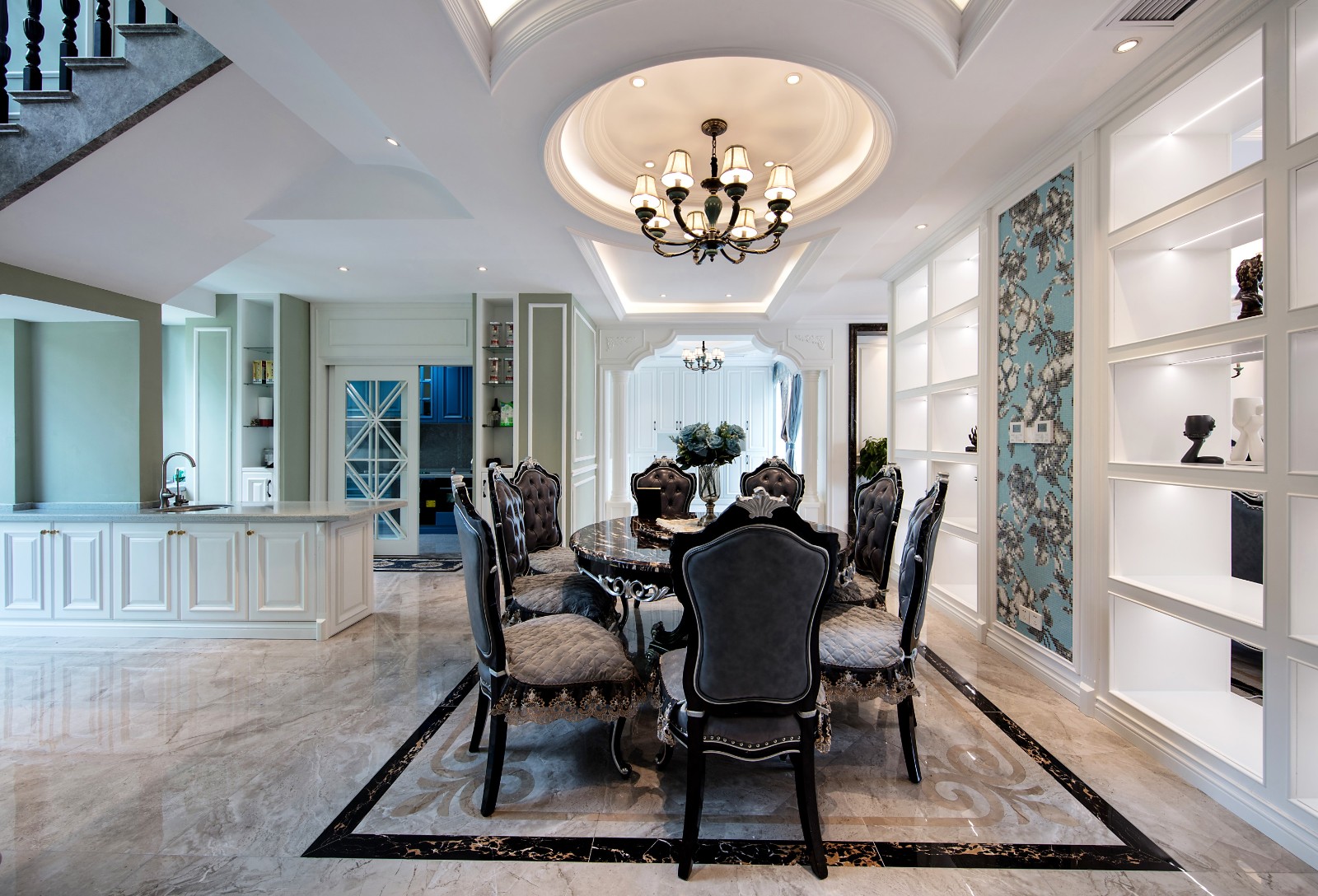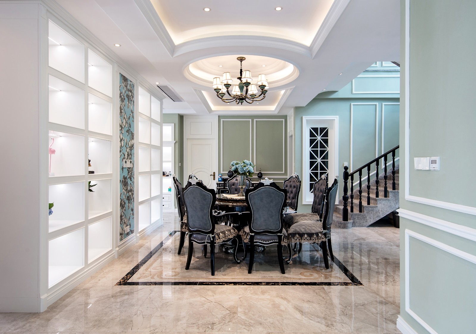 大理石暗紋地板清冷而又不失高雅氣息,搭配以圓形藝術感吊燈設計、復古造型吊燈,為就餐區域奠定了典雅格調氣息。
