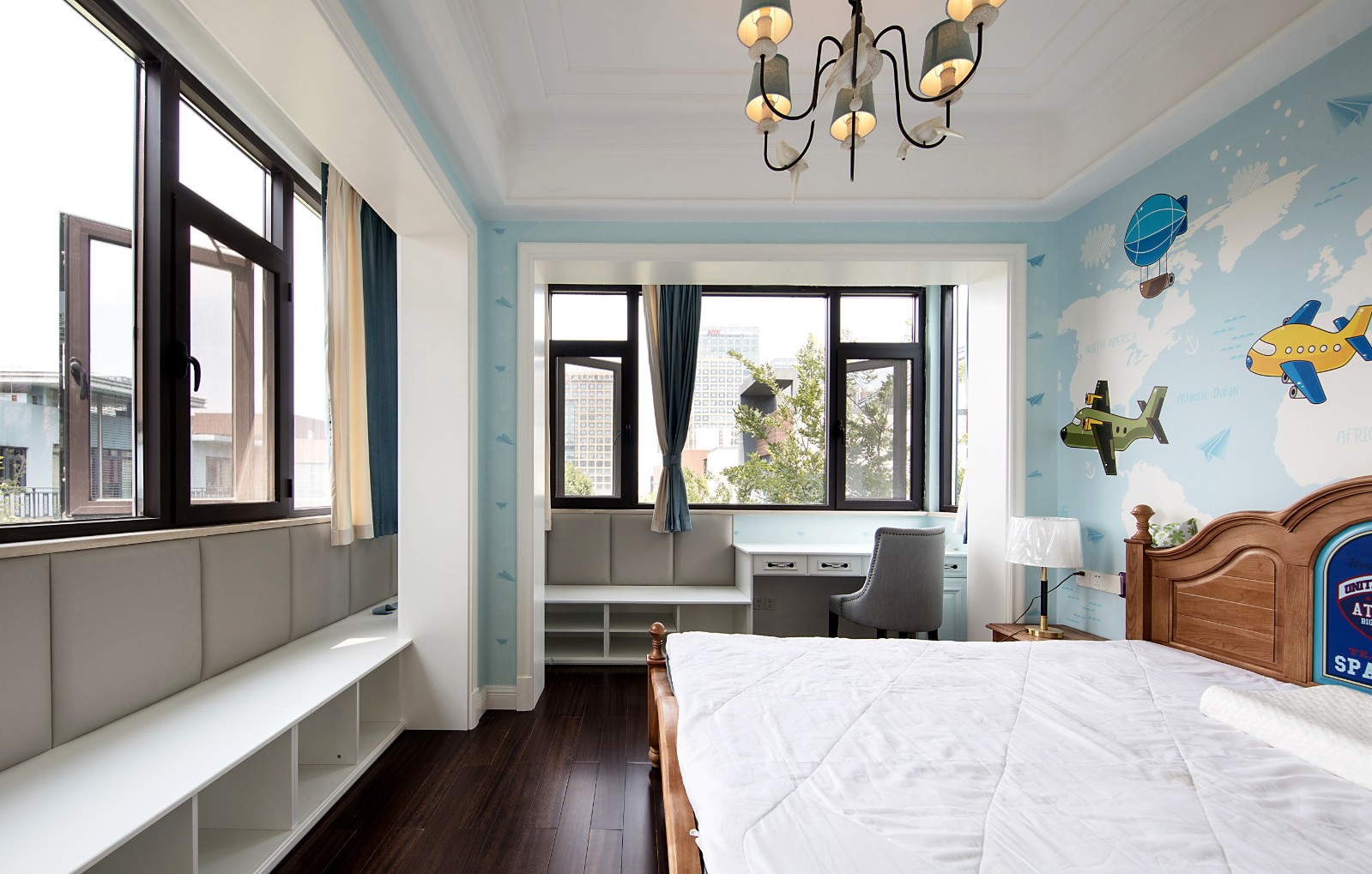 卡通造型的墻面設計讓兒童房的童真趣味感十足,兩面墻都設置了大面積的窗戶,確保室內空氣的流通。