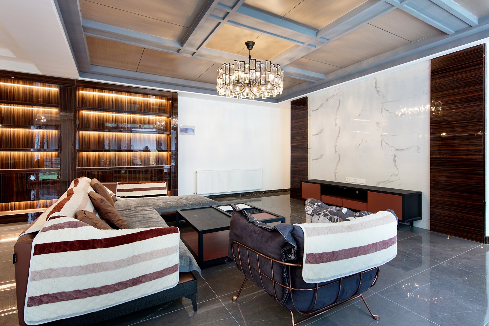 大理石背景墻搭配上灰色地磚,為地下空間營造了一種清雅的氣質。而是絲絨材質的沙發則讓空間多了一抹柔和溫馨感。