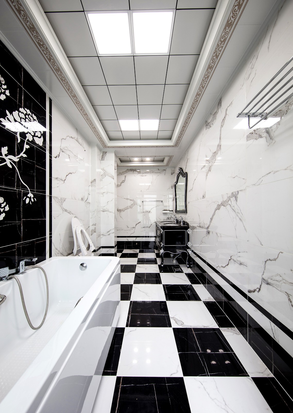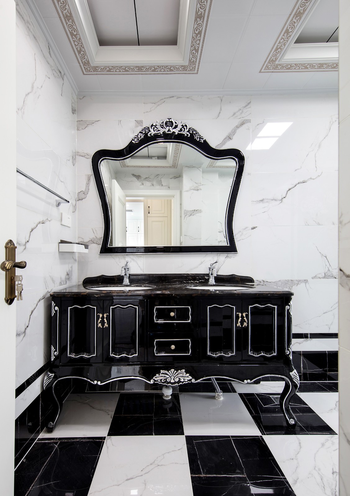 衛生間區域借助黑白色瓷磚的碰撞營造一種超現代的時尚感,而造型獨特的置物柜與鏡子,則讓衛生間區域多了一抹精致的貴族氣息。