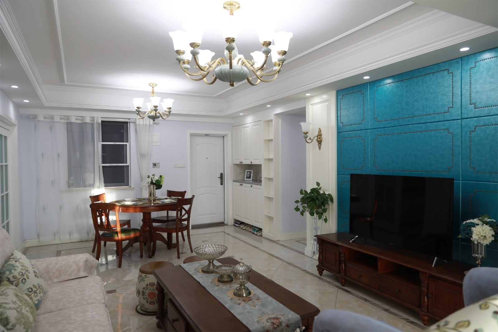 淡藍色的墻面搭配上淺色暗紋的沙發,低調中又帶有一抹淡淡的清新氣息。木質桌子則與不易沙發之間形成碰撞,提升了空間的立體感與質感。