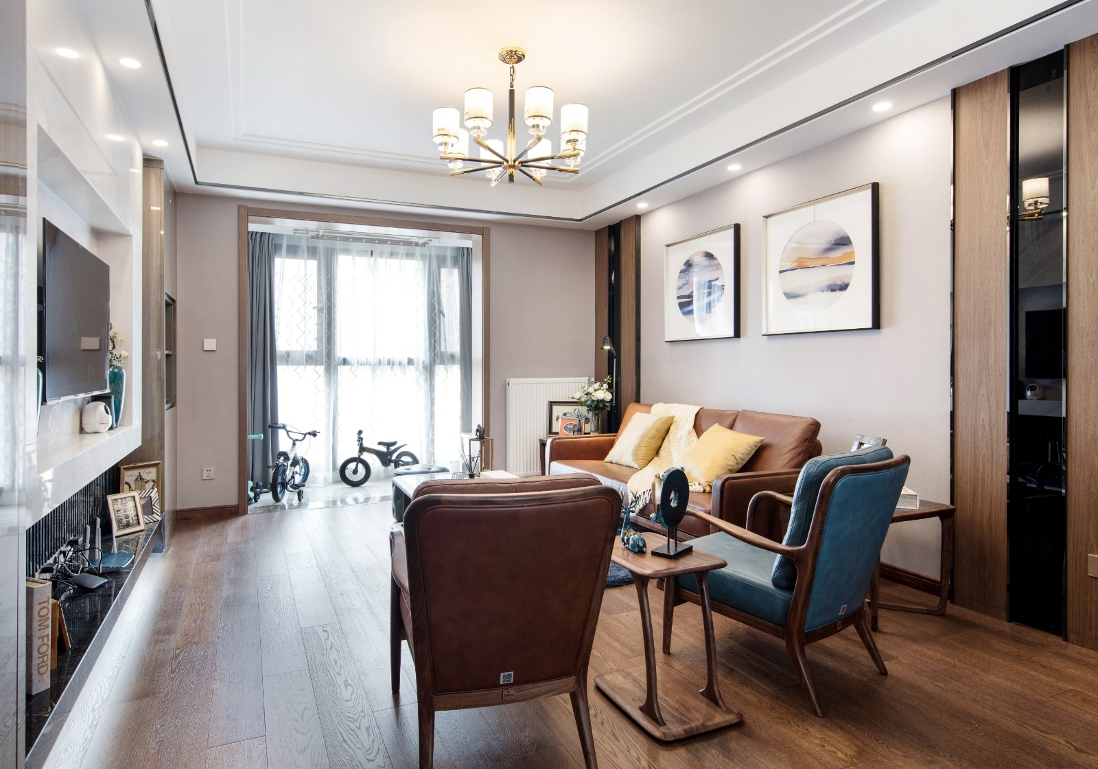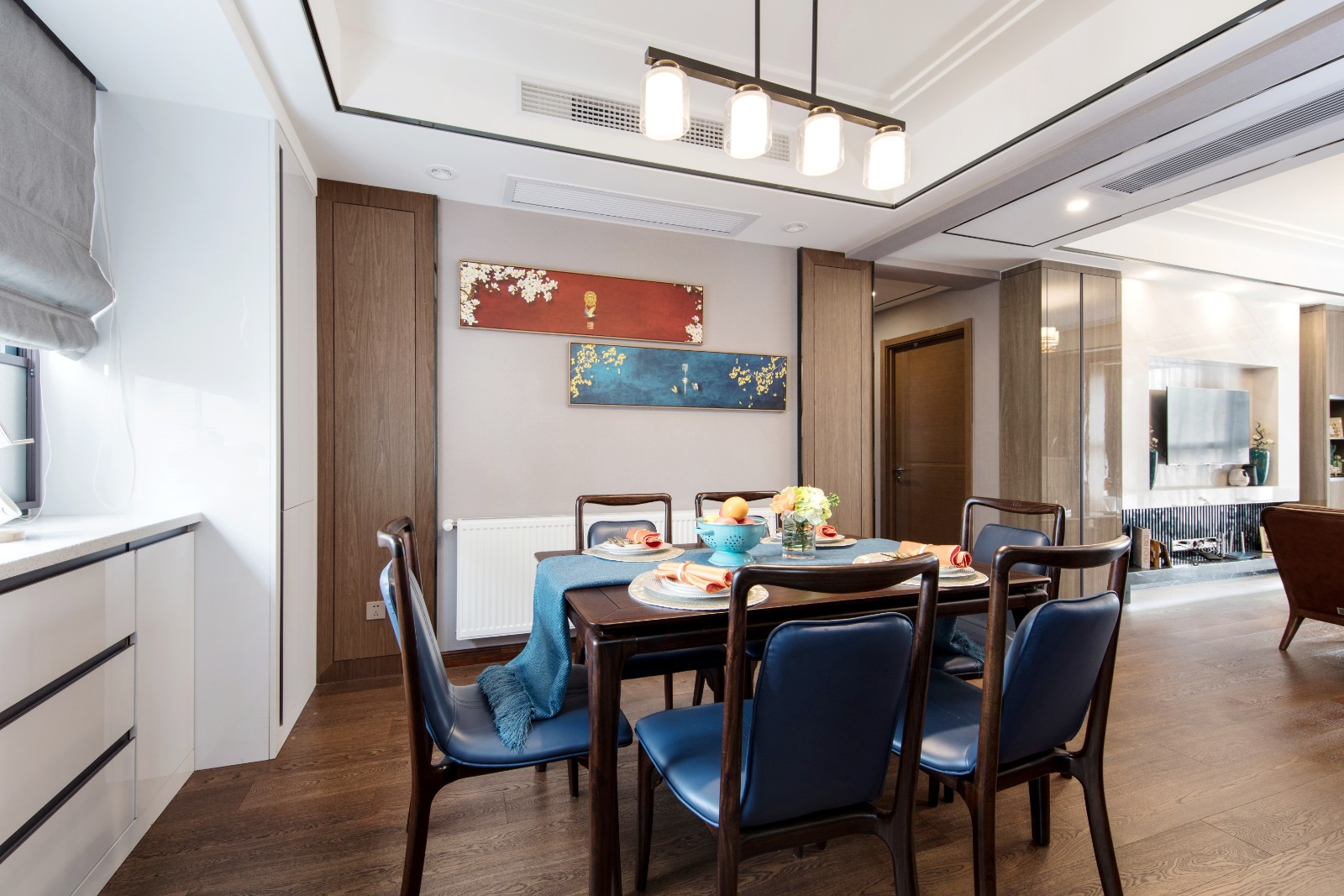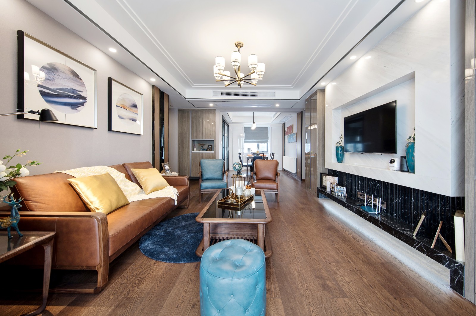 嵌入式的電視背景墻點綴上風格青花瓷花瓶,讓空間中流淌著優雅古韻。