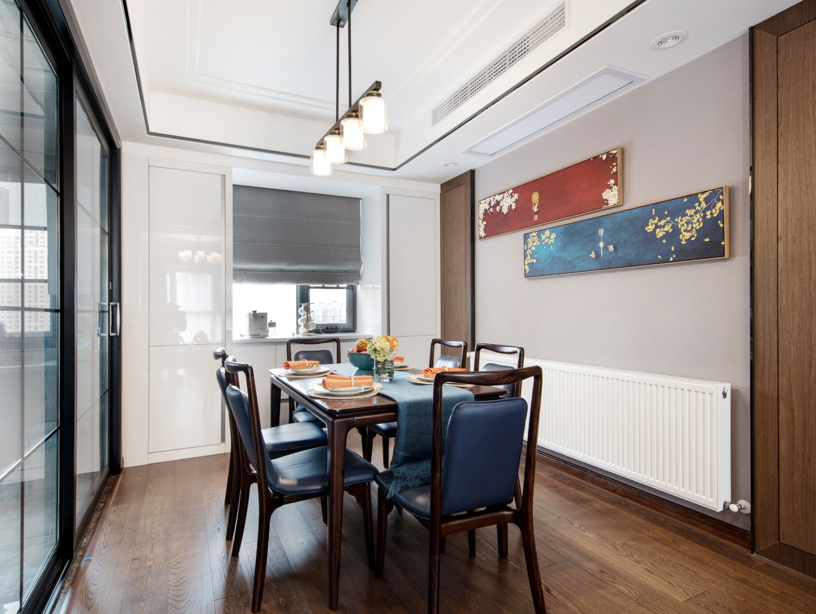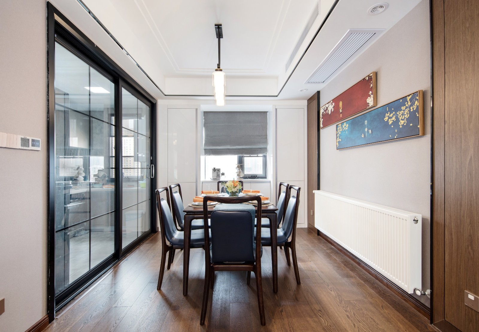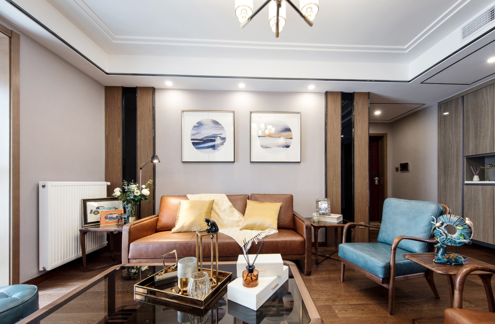 大面積深褐色的木質地板搭配上清新掛畫,讓中式風所特有的典雅韻味得到很好的表達。