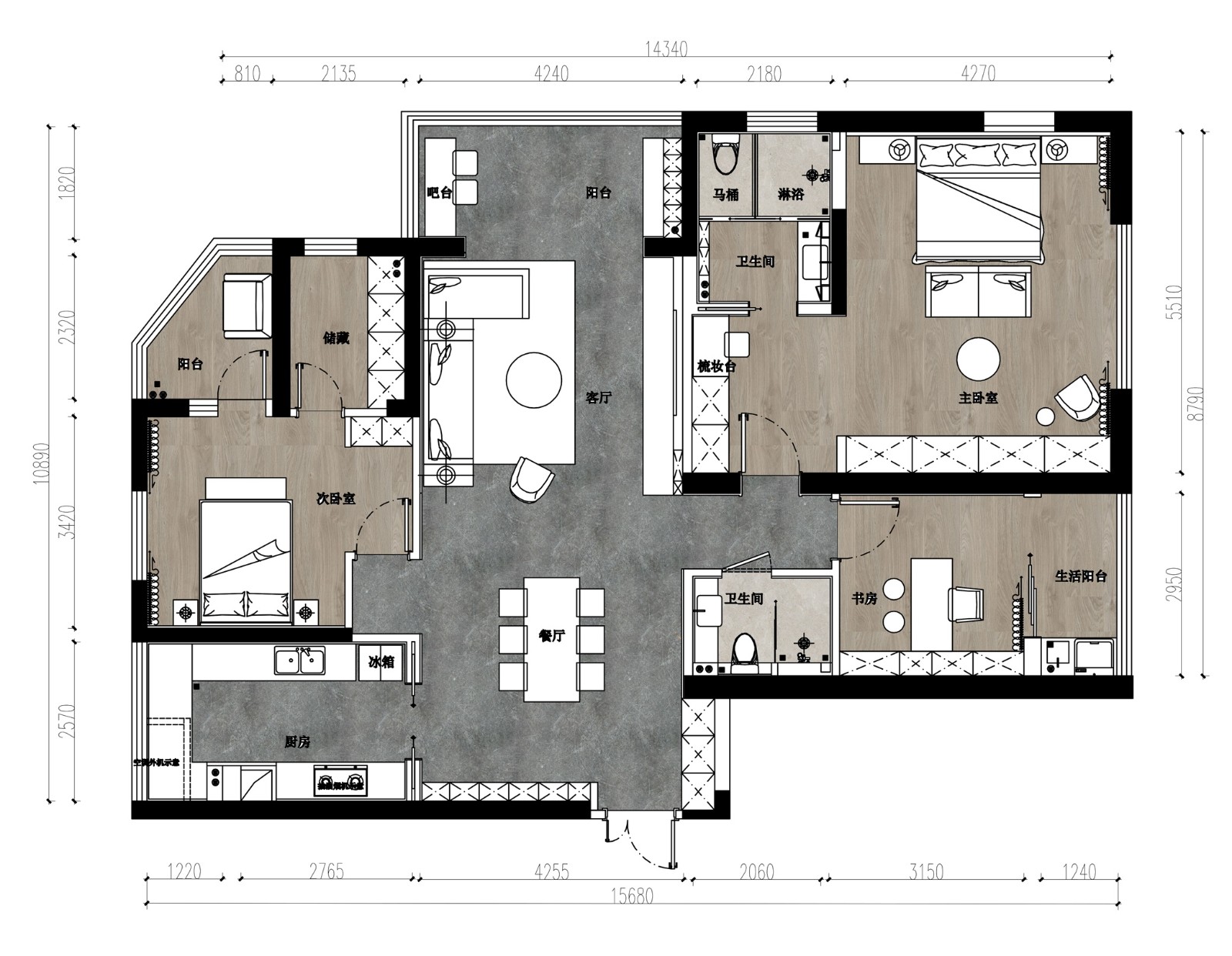 為保障空間整體的銜接感,就餐區域選用了與會客區域一致的配色與桌椅,通過座椅的體量與擺放進行空間區分。