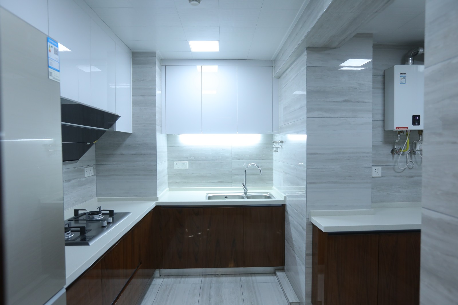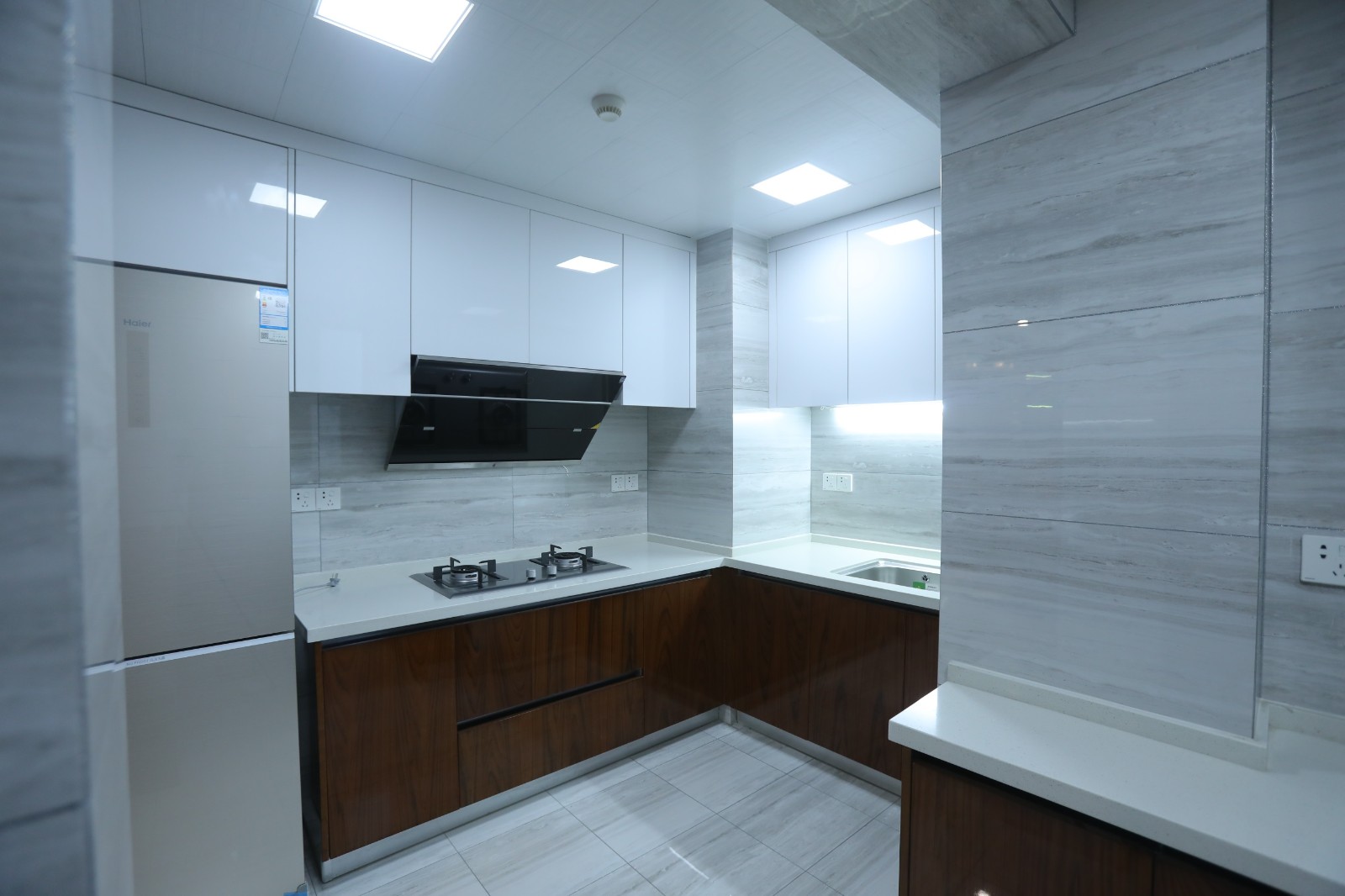 廚房以簡約的白色作為主基調色,從視覺上放大空間,而櫥柜處的木質門既可以與外部空間形成呼應,又提升了廚房區域的結構感。