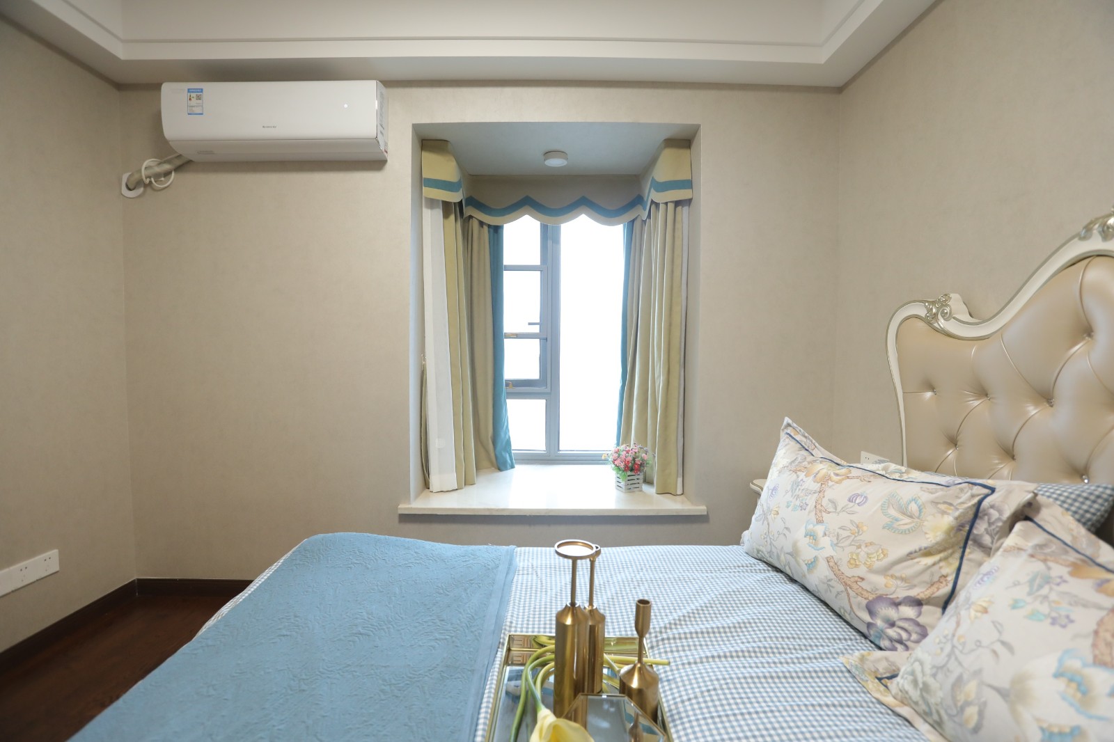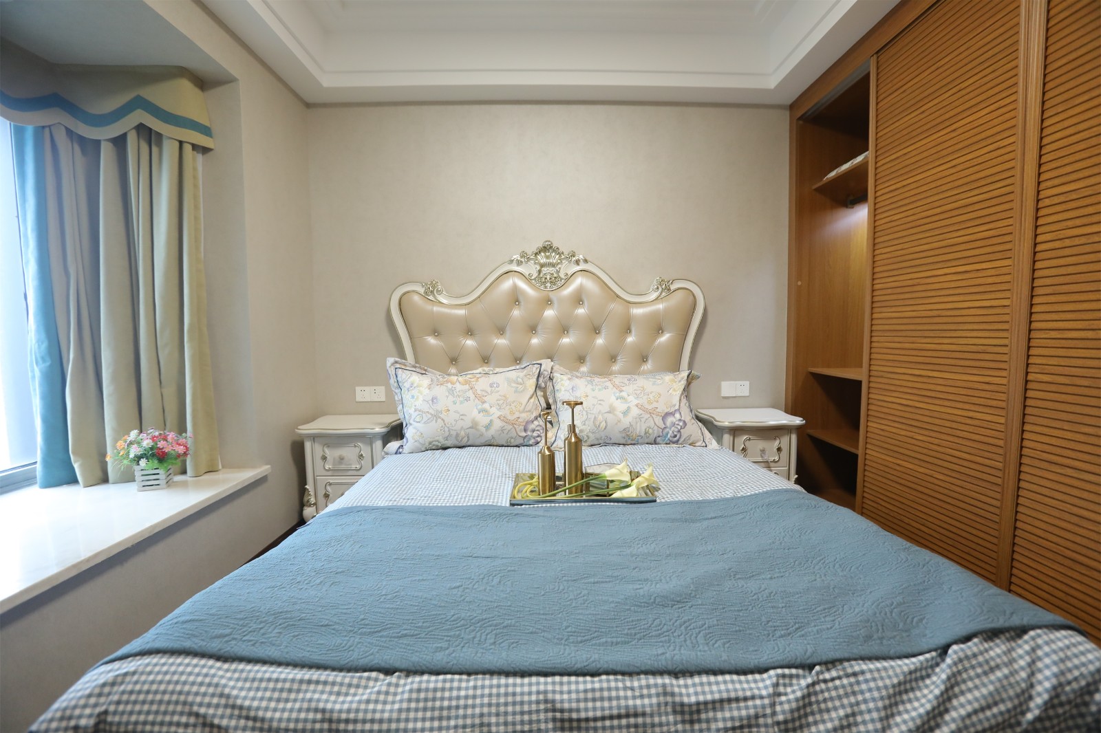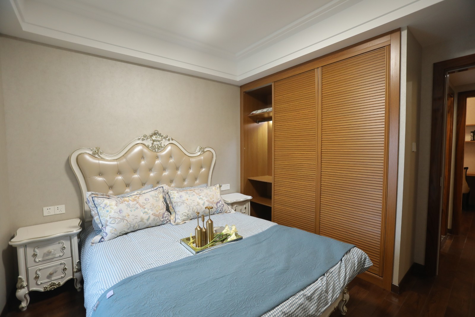 復古造型衣柜奠定空間古韻氛圍,帶有造型設計的床頭柜,則為空間平添精致趣味。
