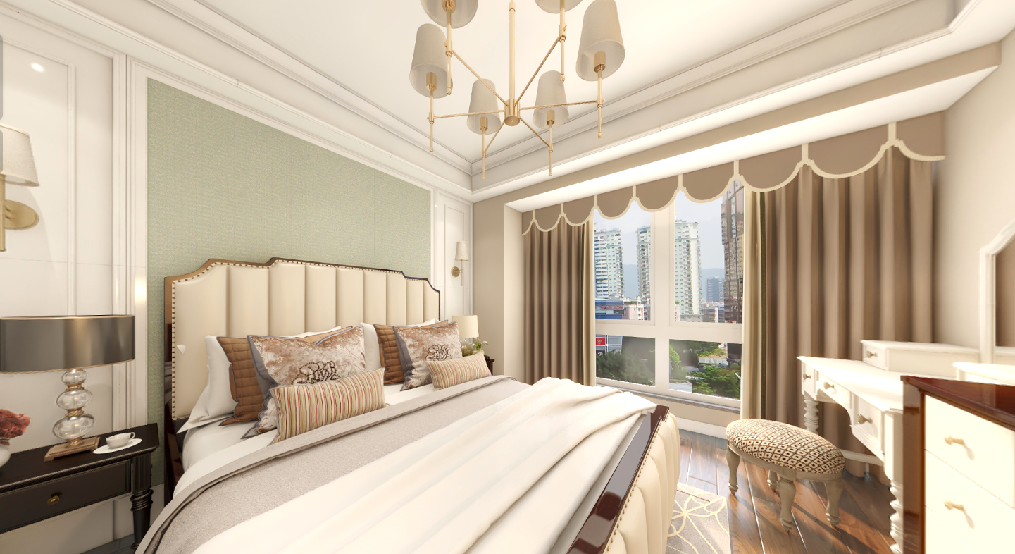 淡綠色的床頭墻搭配上藕粉色的窗簾,讓空間自帶自然清新氣息。而大面積的落地窗則確保陽光能夠自由撒落在室內。