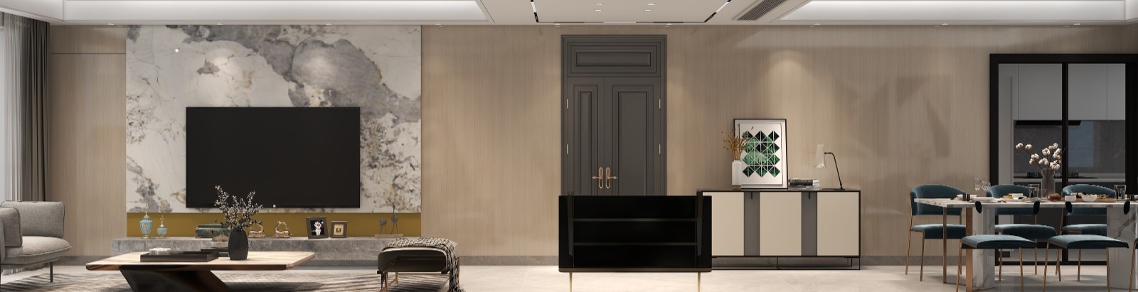 華發外灘首府的這套180㎡的四居室住宅原有的戶型結構符合業主一家人的起居生活習慣,因此設計師沒有對戶型進行過多的改動。而為了滿足家庭孩子們的閱讀、學習需求,設計師將房屋中原本的次臥改造成一個迷你小書房。而走廊過道處則減少各種花里胡哨的設計,強調簡潔,以便于后續生活的清潔打掃。